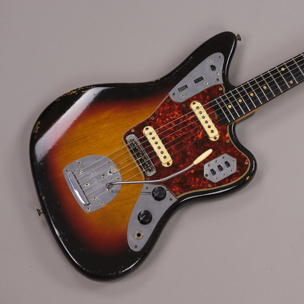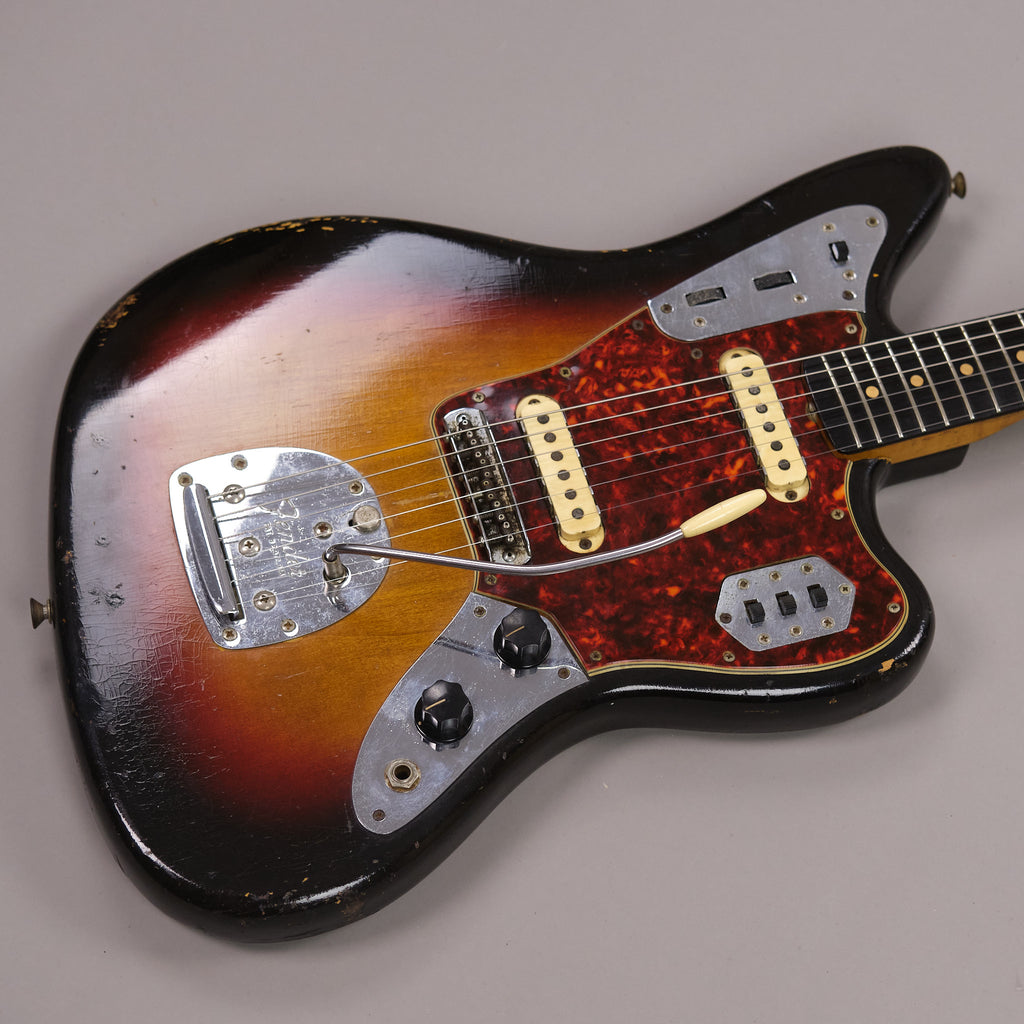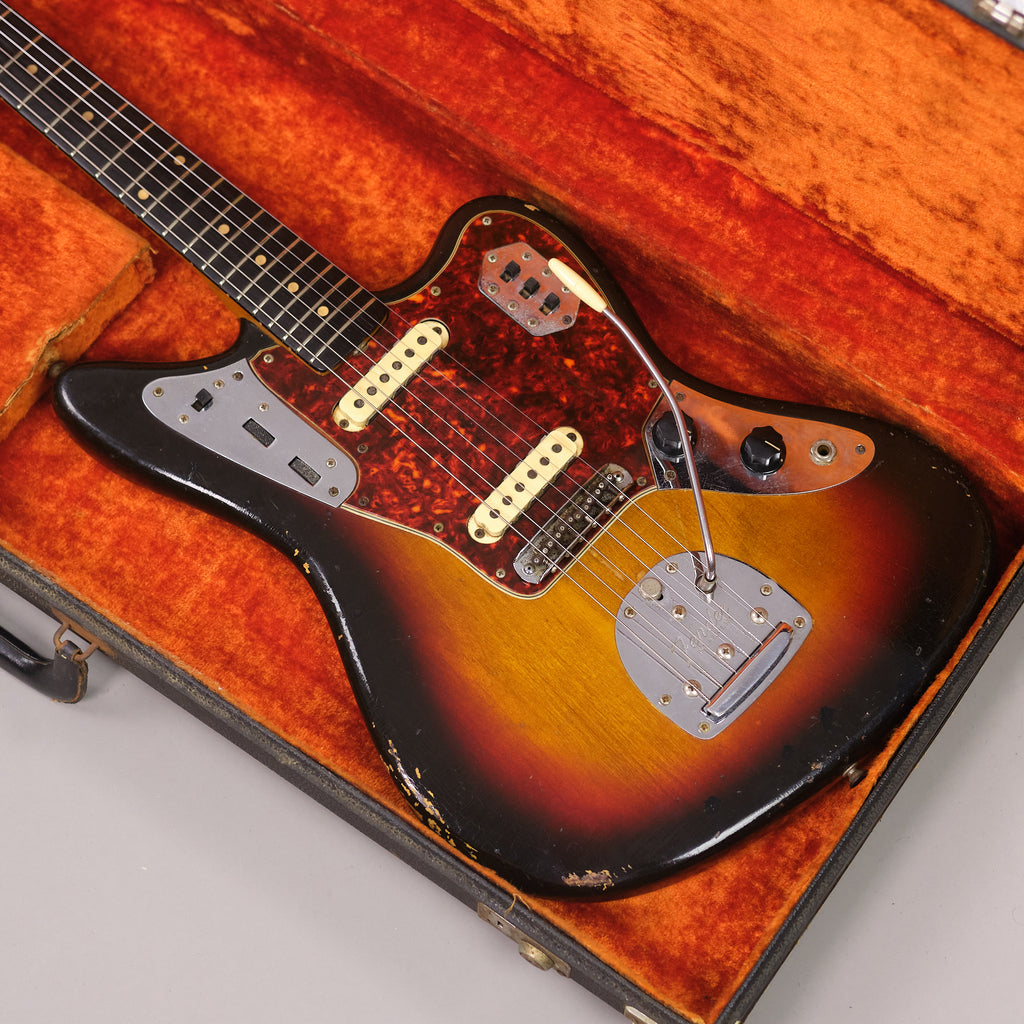 Well loved first year of production Fender Jaguar. Iconic Fender model from a classic year. Highly original and presents honestly. Worn in all the right places. A true vintage relic. Replaced output jack, older re-fret with vintage sized frets (which are on the low side) and new nut. Lovely neck profile which beefs up towards the 12th fret. Pots and neck stamp and neck plate date to the tail end of 1962. Tremolo cavity pencil date is early 1963. Bridge swapped out with a modern 'Staytrem' unit for improved playability however the original threaded barrel bridge is included with the sale. Lightweight and resonant. Excellent sounding pickups. Case is an original 'no logo' pre CBS c1964 Fender case. Neck plate inscribed 'GRETA 140-38-3365'. Serial number 66797. Made in USA.