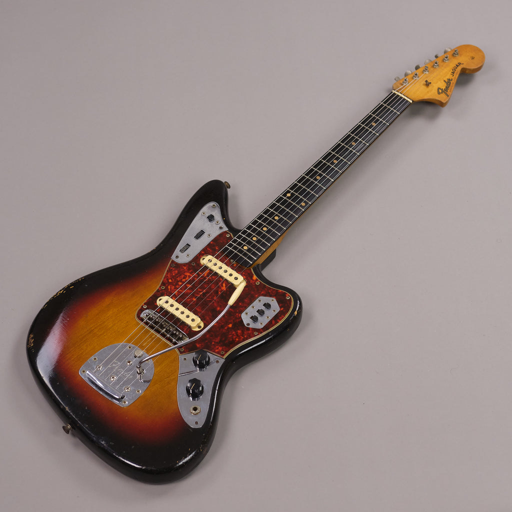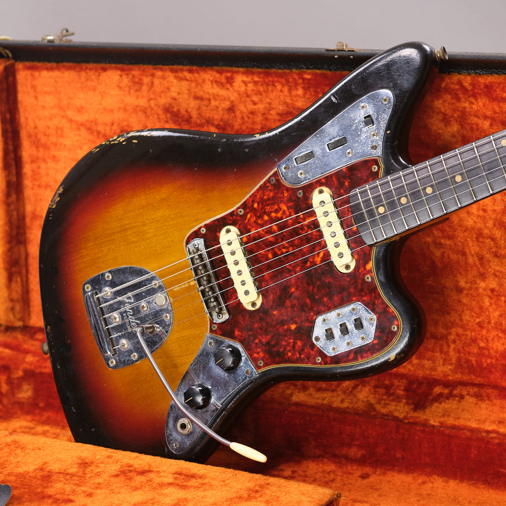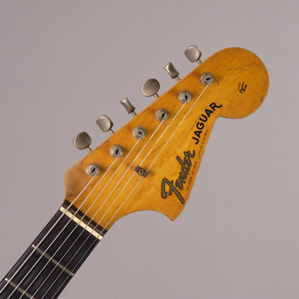 Well loved first year of production Fender Jaguar. Iconic Fender model from a classic year. Highly original and presents honestly. Worn in all the right places. A true vintage relic. Replaced output jack, older re-fret with vintage sized frets (which are on the low side) and new nut. Lovely neck profile which beefs up towards the 12th fret. Pots and neck stamp and neck plate date to the tail end of 1962. Tremolo cavity pencil date is early 1963. Bridge swapped out with a modern 'Staytrem' unit for improved playability however the original threaded barrel bridge is included with the sale. Lightweight and resonant. Excellent sounding pickups. Case is an original 'no logo' pre CBS c1964 Fender case. Neck plate inscribed 'GRETA 140-38-3365'. Serial number 66797. Made in USA.