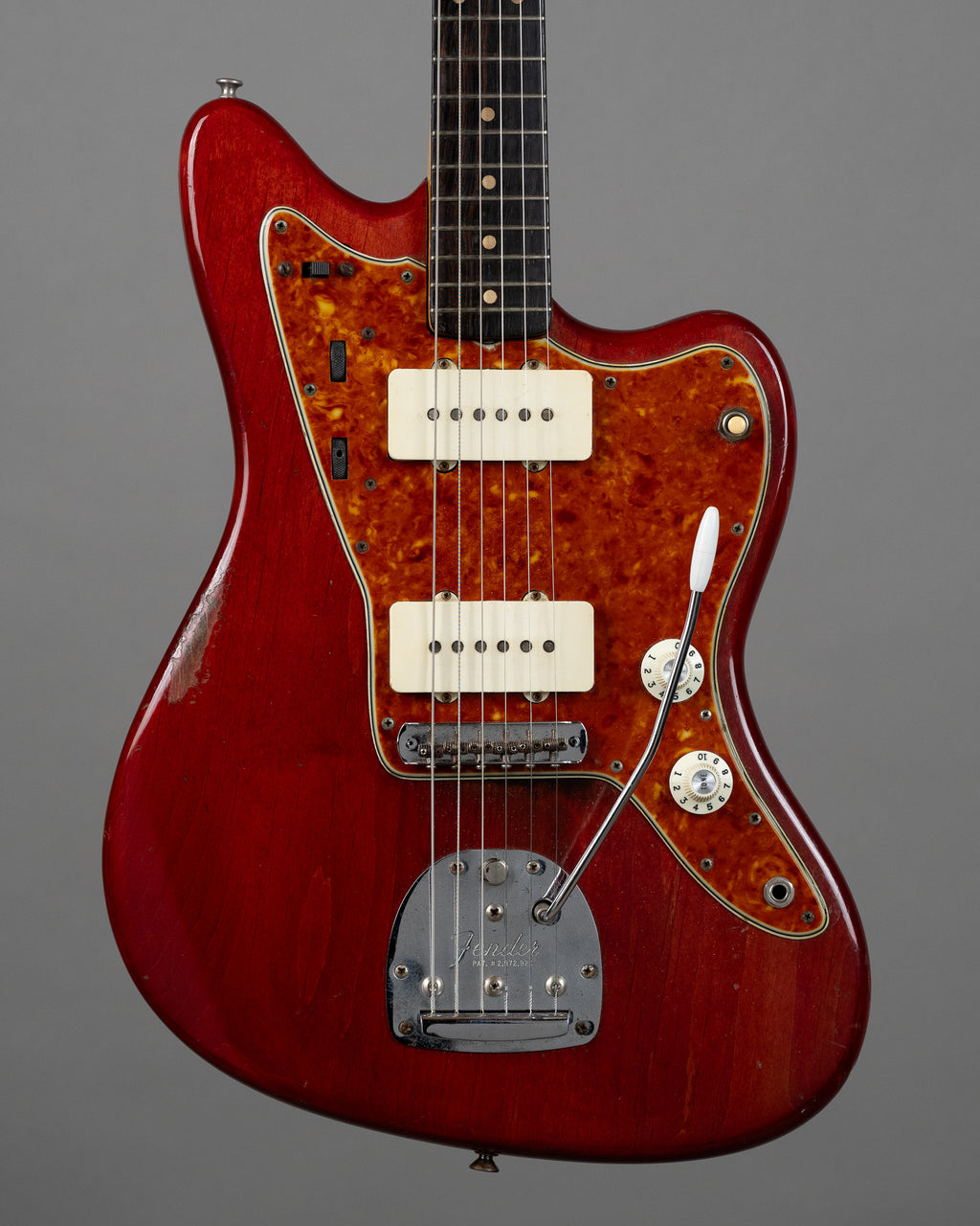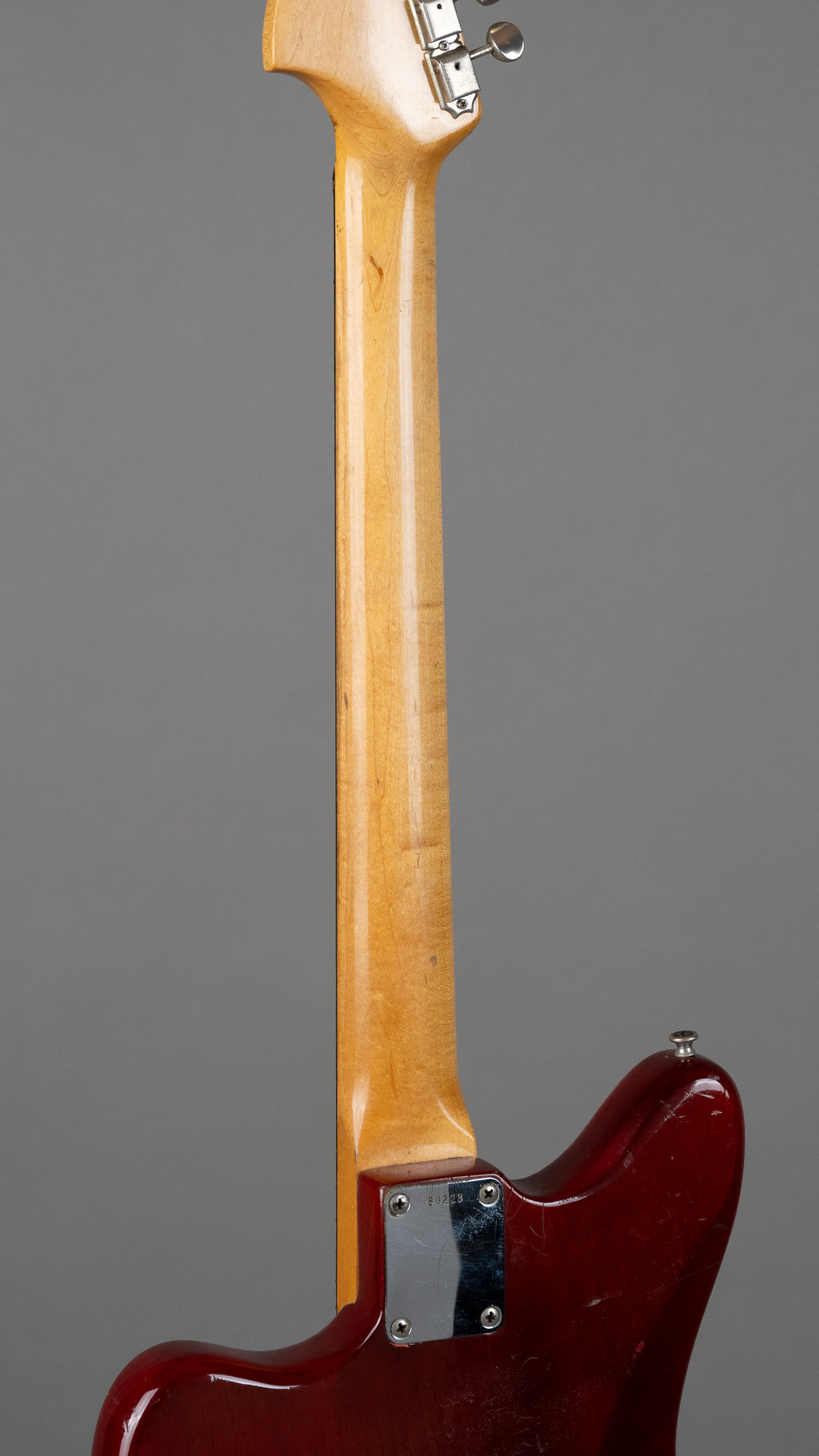 Player grade '62 Fender Jazzmaster. Original sunburst finish has been stripped from the body and it has been refinished black at some point and then cherry red translucent stain. The headstock has also been refinished in a matching red stain and the Fender decal replaced with a later transition Fender logo. There is some light overspray on the back of the neck, and the guitar has been refretted with medium size frets. The body shows the correct routes and shielding plates for an early 60s Jazzmaster. The wiring loom is mostly intact with some extra soldering. Pots date to 1961 (volume) and 1962 (tone) The Bass Circuit thumb wheels are correct. The pickups have been replaced with what appears to be Seymour Duncan Jazzmaster pickups. The guitar has the original bridge and tremolo unit and the correct early tall bridge thimbles. The tremolo arm is a replacement. The volume and tone knobs are replacements. The original machine heads have been replaced. The previous owner, bought this in the early '90s, and while this may not be anywhere near the cleanest Jazzmaster in the world..but it is one hell of a great playing and sounding guitar..probably why the last he held on to it as long as he did. Made in the USA...comes with a hard shell case. #80223 Weight: 3.55kgs