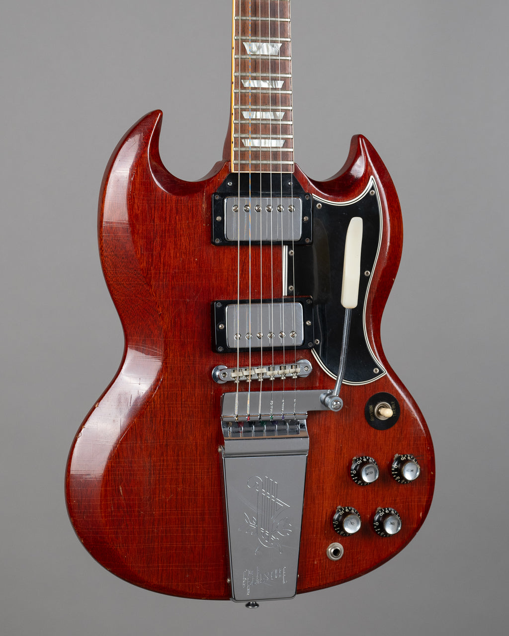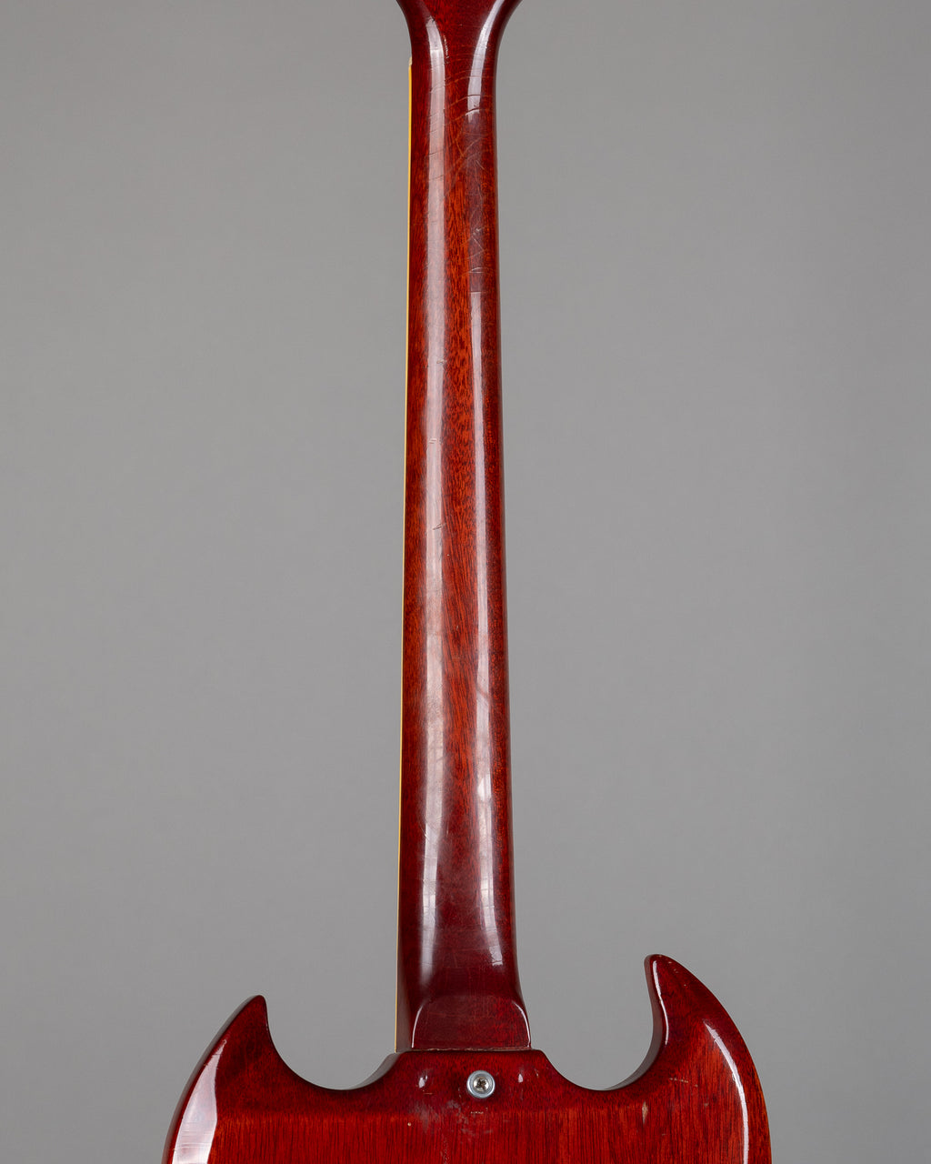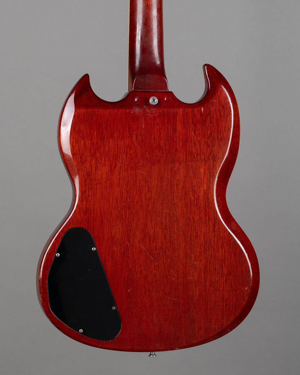Lightweight mid-1965 SG Standard with a strong acoustic response and a stable feel overall. The neck angle is good and the Maestro setup works superbly (probably one of the most functional examples I've come across). This gives the guitar a settled, confident feel in use. Resonant, lively, and immediate unplugged. Retains the transitional nut width, measuring just over 40mm. It sits between the earlier wide necks and the later narrow-nut examples and feels balanced in the hand. There is a very old neck heel repair. The repair included two dowels, visible when the plastic cover above the neck pickup is removed. The rear of the neck heel shows two small impressions consistent with clamp marks from the original repair.