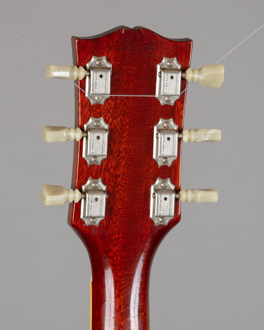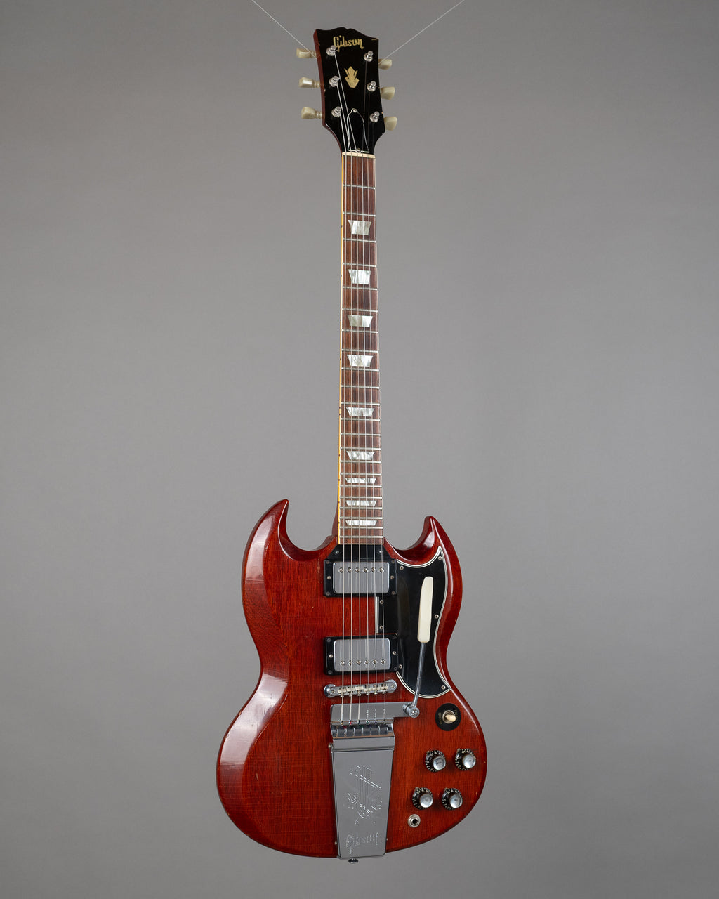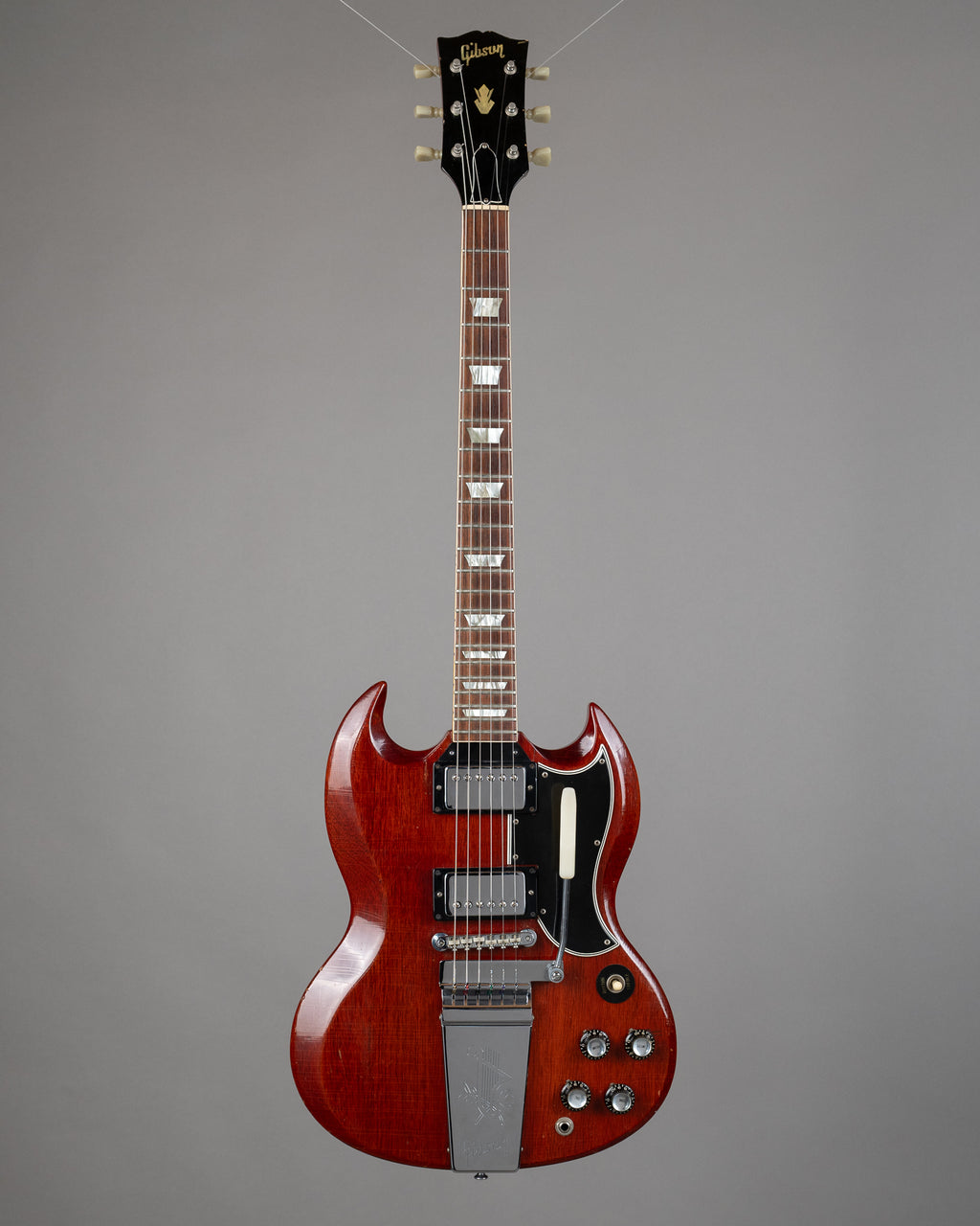 Lightweight mid-1965 SG Standard with a strong acoustic response and a stable feel overall. The neck angle is good and the Maestro setup works superbly (probably one of the most functional examples I've come across). This gives the guitar a settled, confident feel in use. Resonant, lively, and immediate unplugged. Retains the transitional nut width, measuring just over 40mm. It sits between the earlier wide necks and the later narrow-nut examples and feels balanced in the hand. There is a very old neck heel repair. The repair included two dowels, visible when the plastic cover above the neck pickup is removed. The rear of the neck heel shows two small impressions consistent with clamp marks from the original repair.
