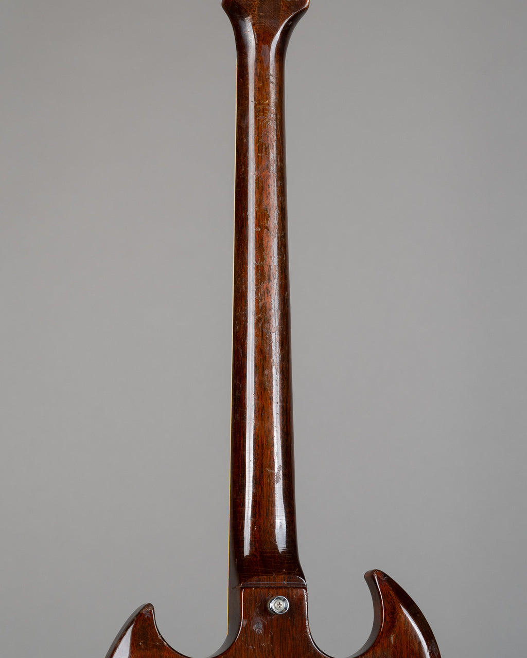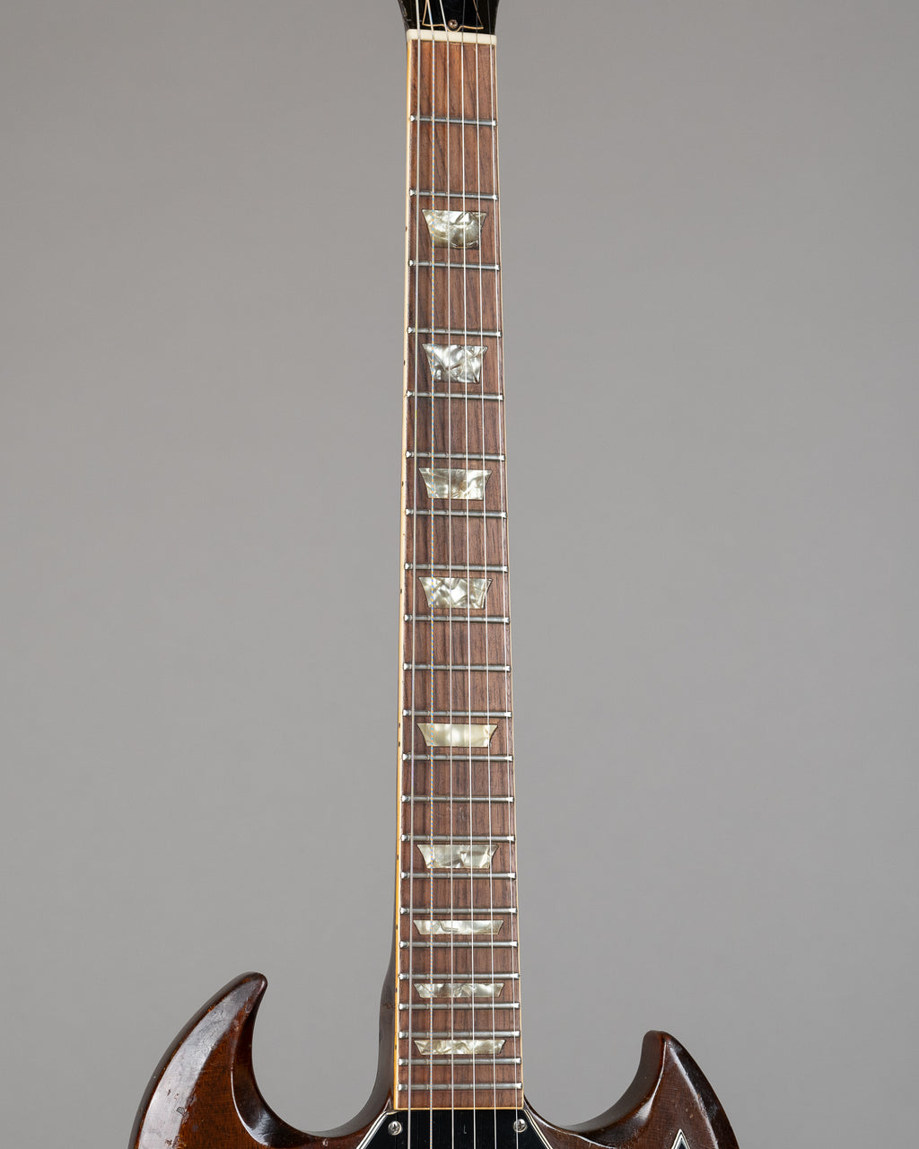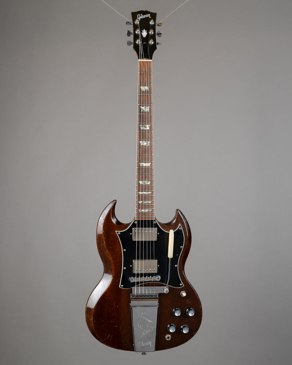 A '68 SG in walnut from 1968. A few changes from stock, but an absolutel ripper to play, and as you can see...it has been played...a lot. Changed pots, and jack, and sporting a set of Gotoh machineheads. The control knobs are repros, and the bridge is a replacement too. It has a small patch where a coil tap switch once was, and new chrome pickup covers over the original pickups. No breaks. Of course it has had a refret..it's near 60 years old. A cooking SG from '68. If you are in the market, as of the time of writing this we have 2 late 60s SG's in stock...come and have a play and see which one you prefer. Made in the USA, comes with a period correct, blue lined, leather ended case. SN 904517 Weight: 3.4kgs