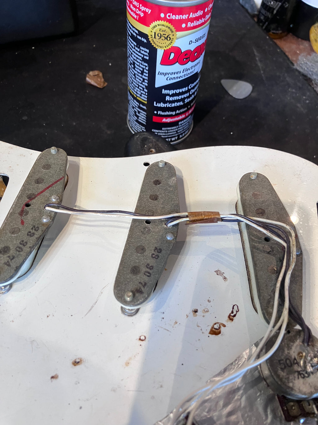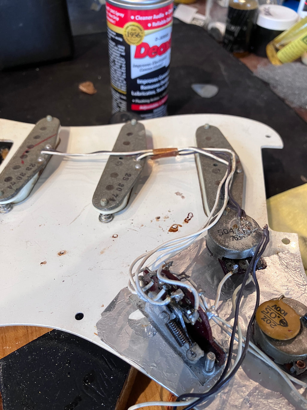 Original pickups and wiring harness are still in place, with a replaced guard and a single changed volume pot. Both tone pots and the neck date to 1974.