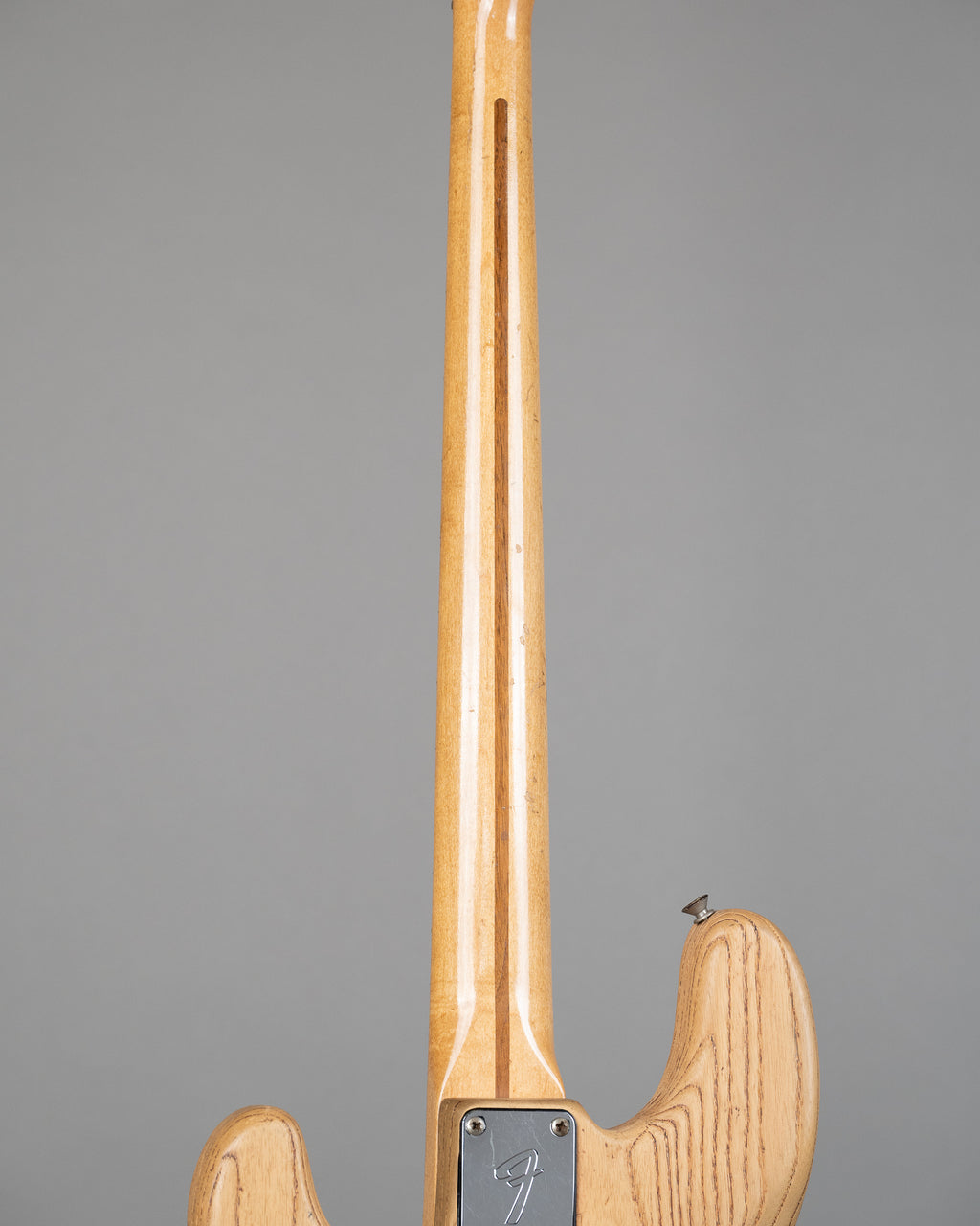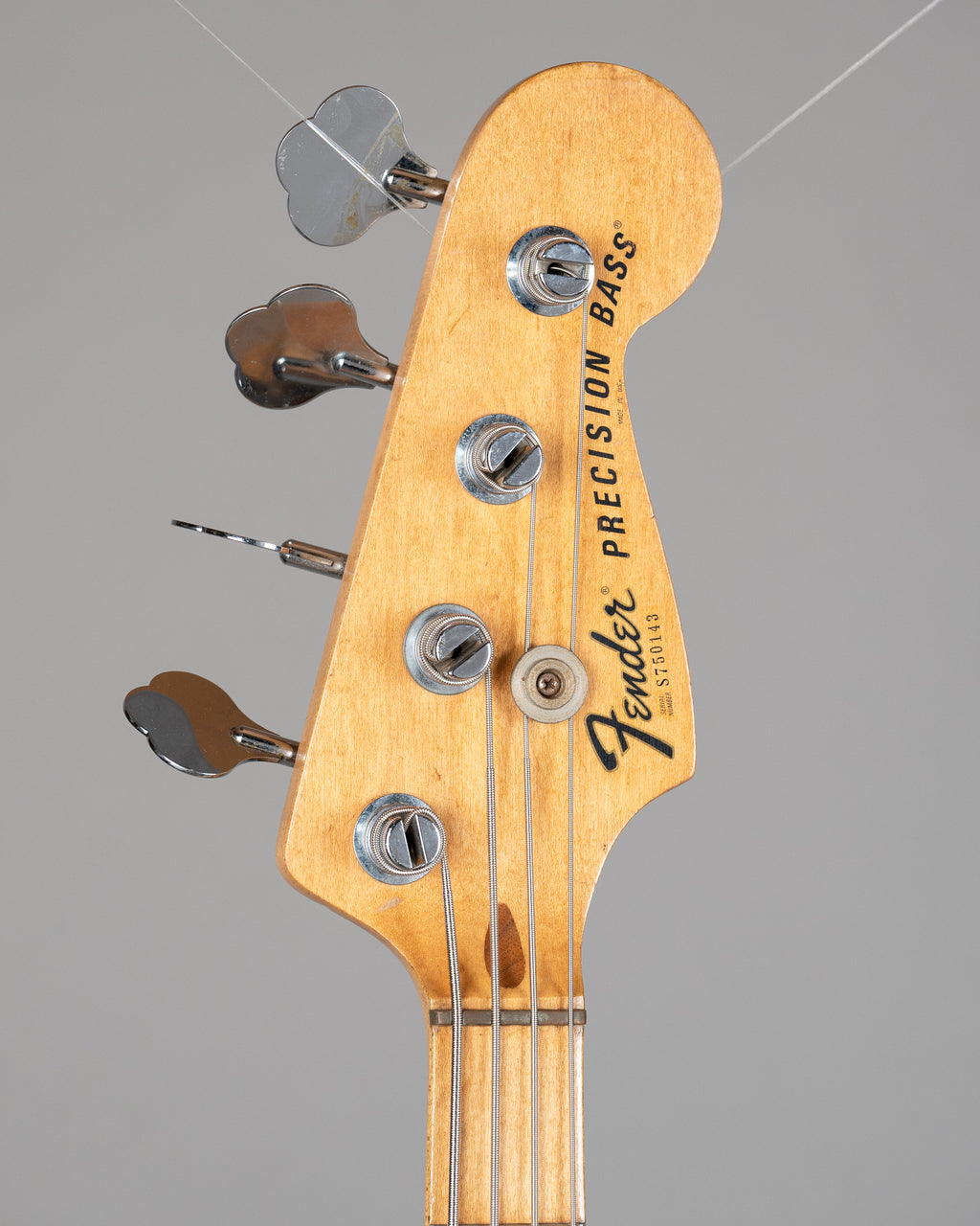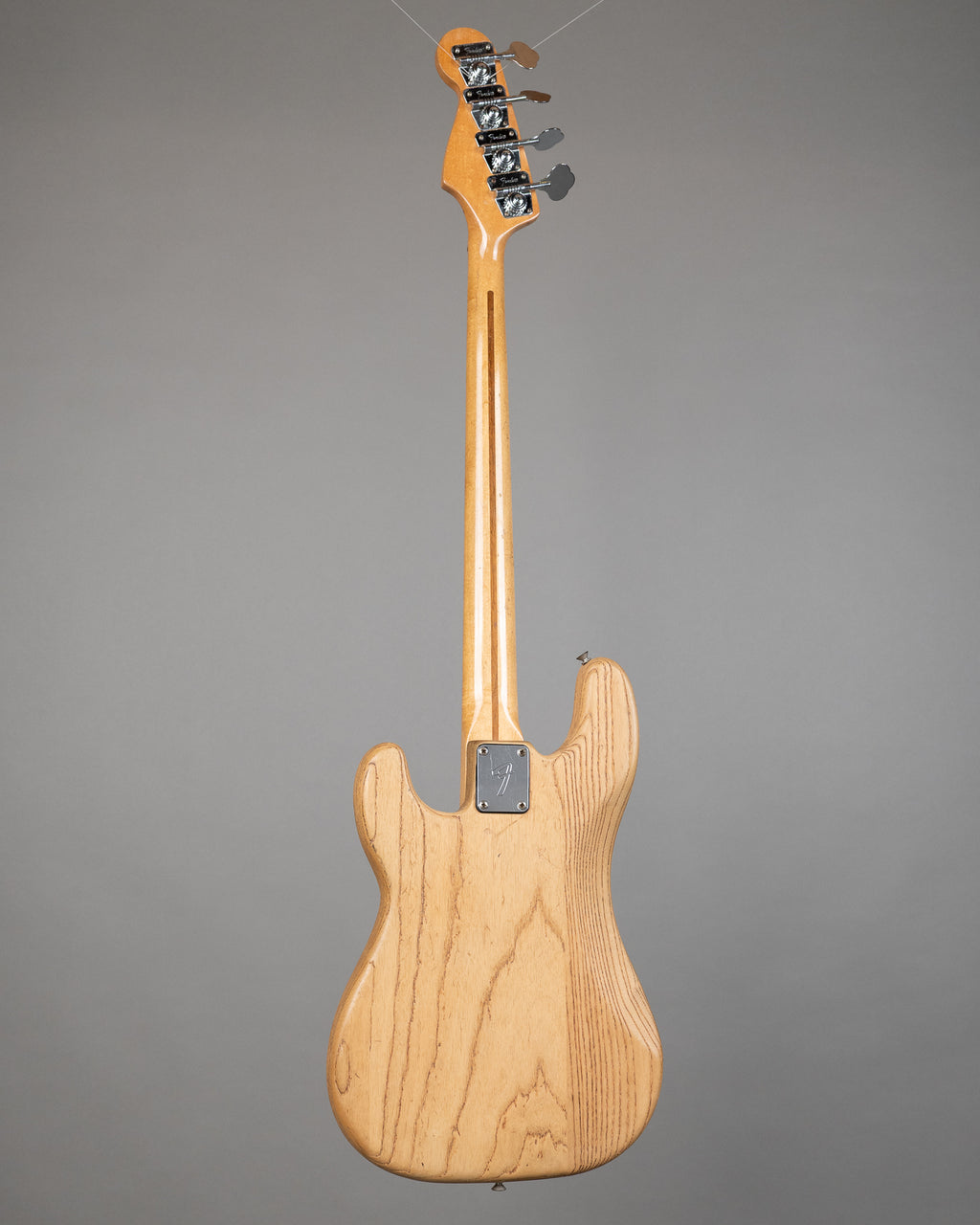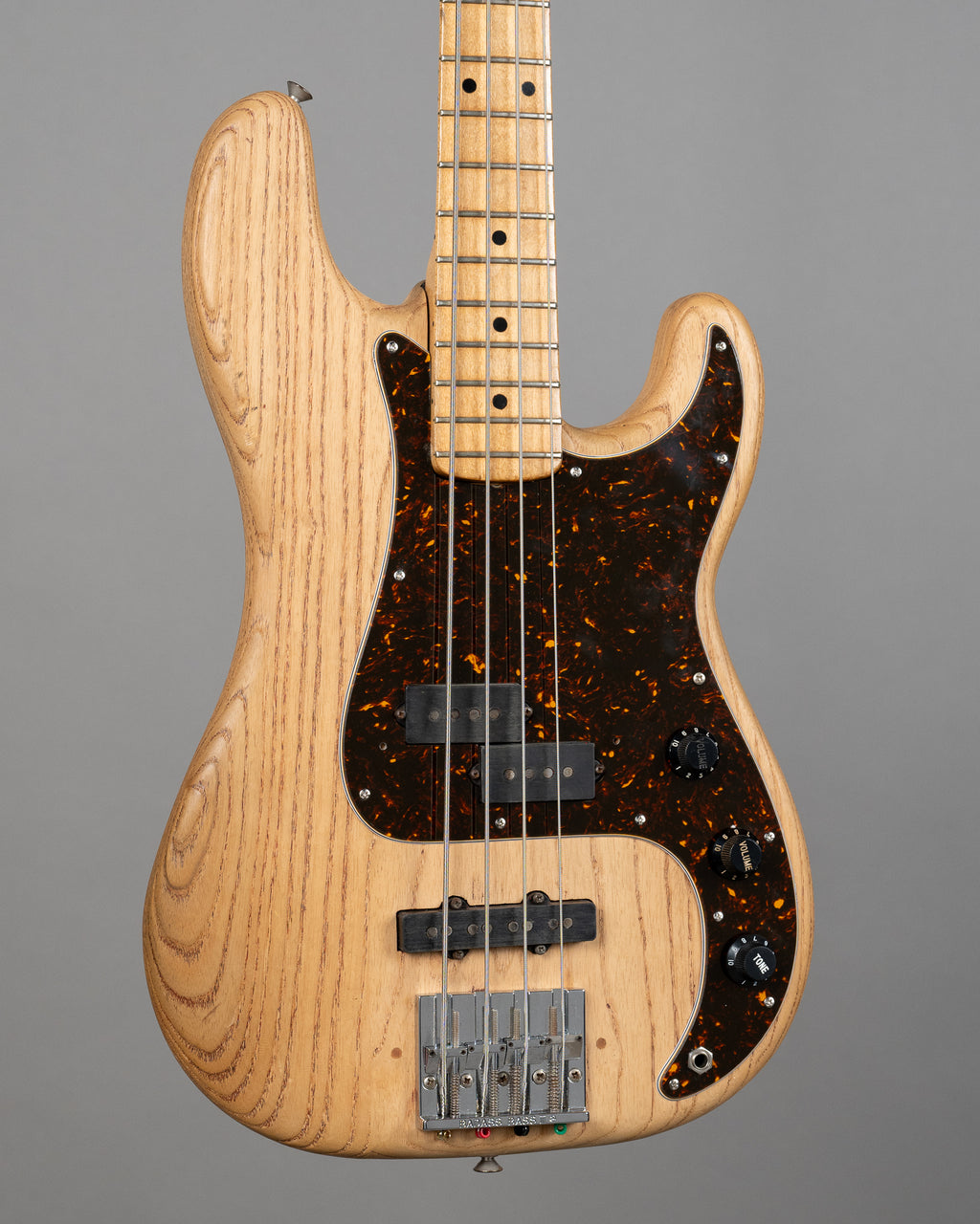 Body has been stripped back to a textured natural finish. A 1975 Fender Jazz Bass pickup has been added at the bridge, with the original Precision Bass pickup retained in the neck position. Both pickup covers are 1970s Fender pieces, though they’ve been painted and sanded at some point along the way.