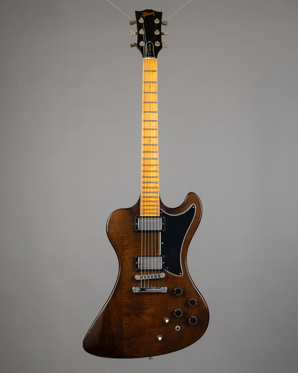 Take an Explorer and a Firebird and smoosh them together. You get the RD “Research & Development” model. One of the more left of centre and experimental guitars of the time period. Certainly one of the more obscure models from Gibson over the years that surprisingly later in life wound up with a cult like following. Loaded with active electronics these were designed to appeal to synth players. Norlin owned both Gibson and Moog at the time. The RD bass was favoured by many but most notably Krist Novoselic of Nirvana. From 1977 we have a pretty badass RD custom in walnut. Made in USA serial 72337103 comes with the original hard case.
