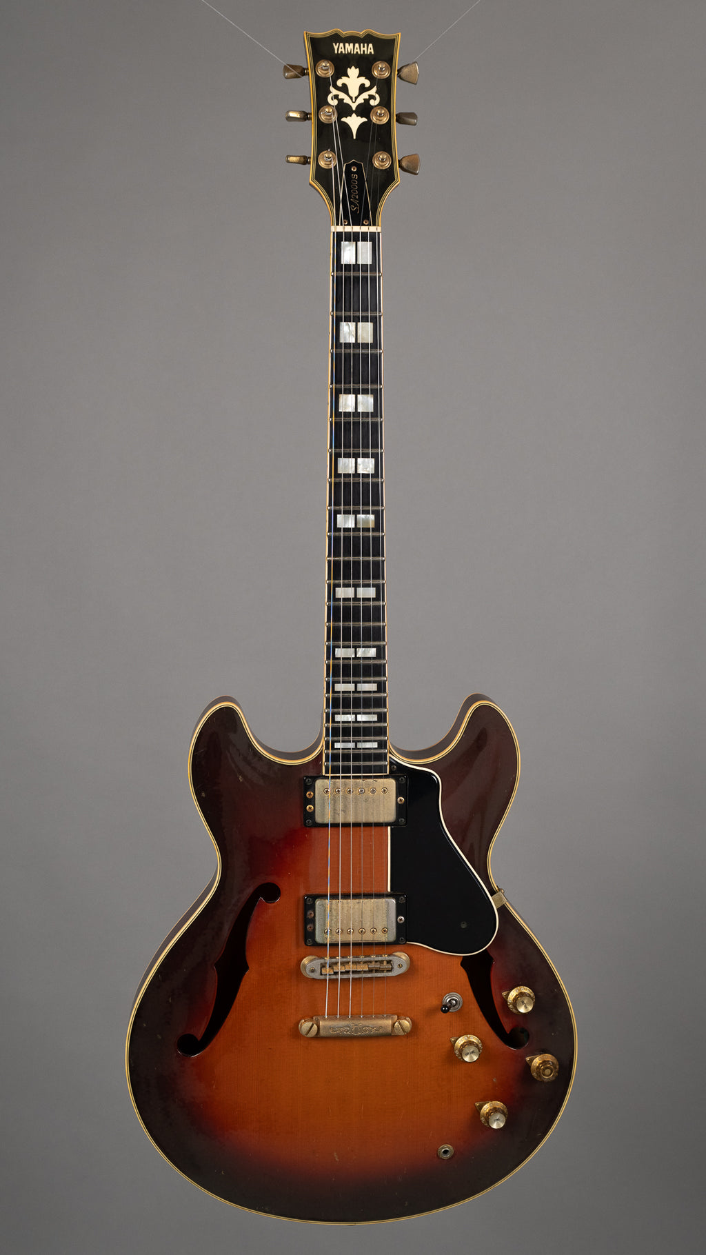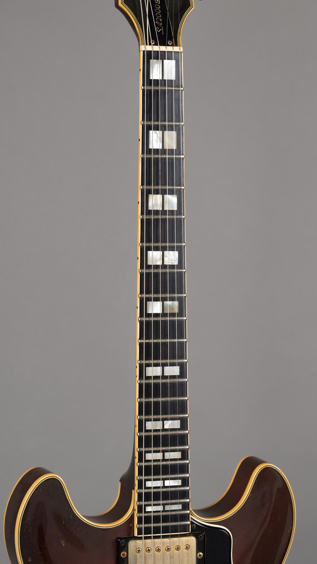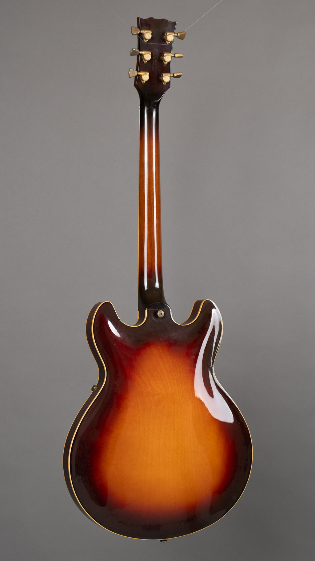 An absolute ripper of a guitar - among the best of the best for ES-335 styles. Solid carved spruce top with a birch and beech ply back / sides. Ebony fretboard with choice abalone split-block inlays. So well made, and so damn good sounding. Dig that gold hardware. Frets have light pitting, and the gloss finish has a small amount of clouding... Electrics are original down the push-push pots (not 'pushing', stuck in 'bucker mode, as is the law). Has had a minor headstock mishap professionally repaired, so between that and that other things mentioned, it's priced accordingly. We're pitching these are going to really shoot up in price over the next little bit... a hell of a lot of guitar for the price!