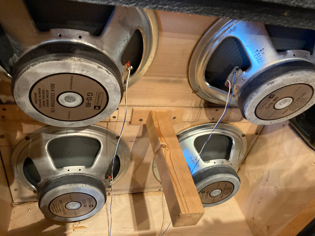 This one has obviously been dragged around pubs in its younger years, but all the speakers are still firing and original to this box. Sat underneath a Marshall JMP for many years.