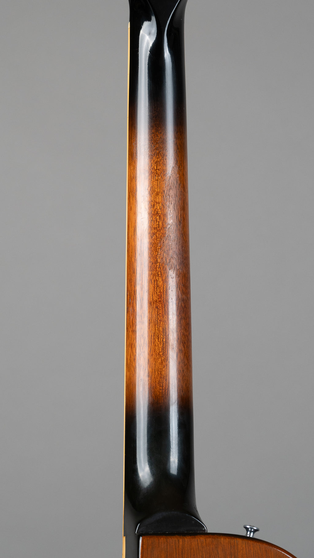 Slender profile mahogany neck with cream binding & black side dots. Beautiful rosewood fingerboard with mother of pearl trapezoid inlays. Frets are in great shape. Grover Rotomatic tuners in perfect working condition. 1 11/16" nut width; 24 3/4" scale length. Neck is straight & truss rod works fine.