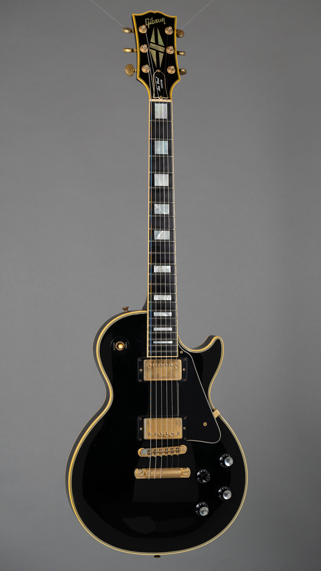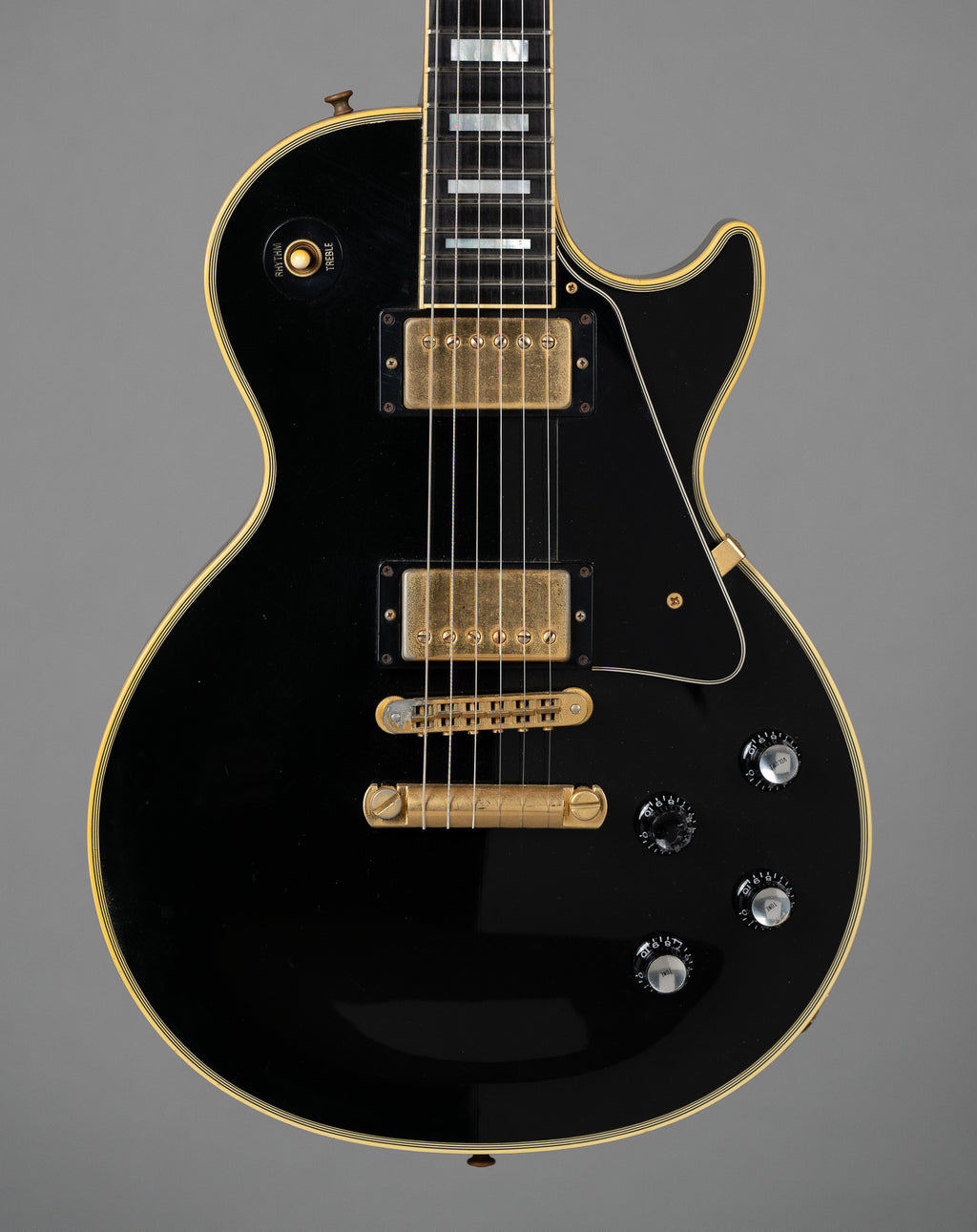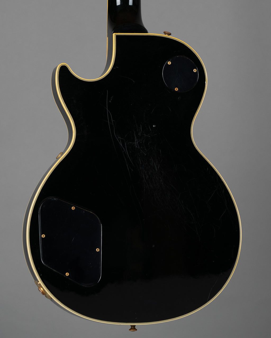 Mid-'90s Custom. Pro neck repair, with a proper volute grafted on for extra neck insurance and a partial refinish on the back. Black. Stock guts, top-wrapped bridge, Grovers up top, and scratches out back where they belong. Gold hardware aged to the perfect shade of mojo. This guitar kills hippies.