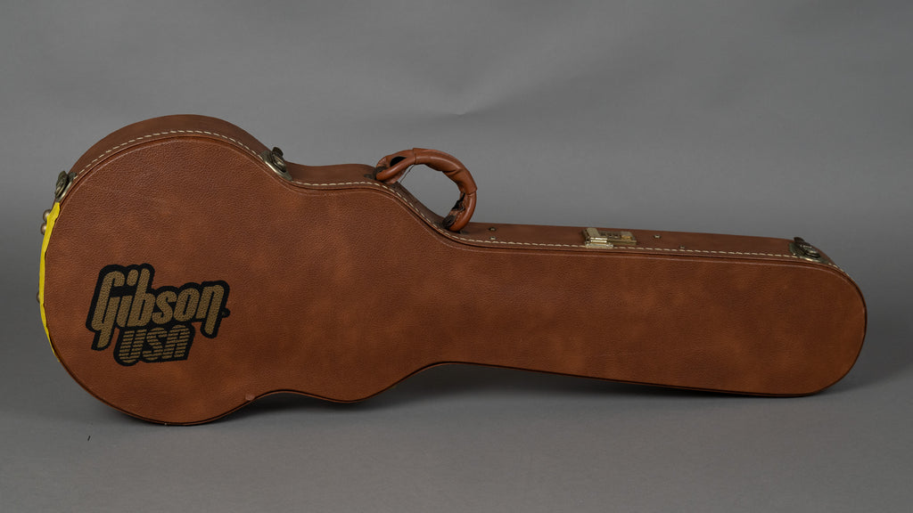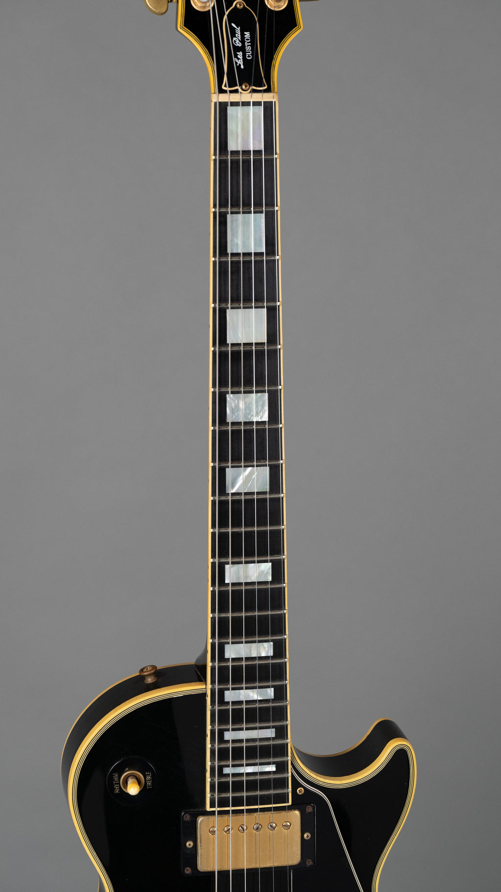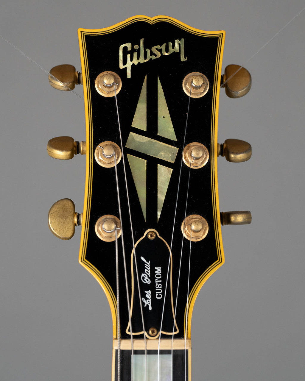 Mid-'90s Custom. Pro neck repair, with a proper volute grafted on for extra neck insurance and a partial refinish on the back. Black. Stock guts, top-wrapped bridge, Grovers up top, and scratches out back where they belong. Gold hardware aged to the perfect shade of mojo. This guitar kills hippies.
