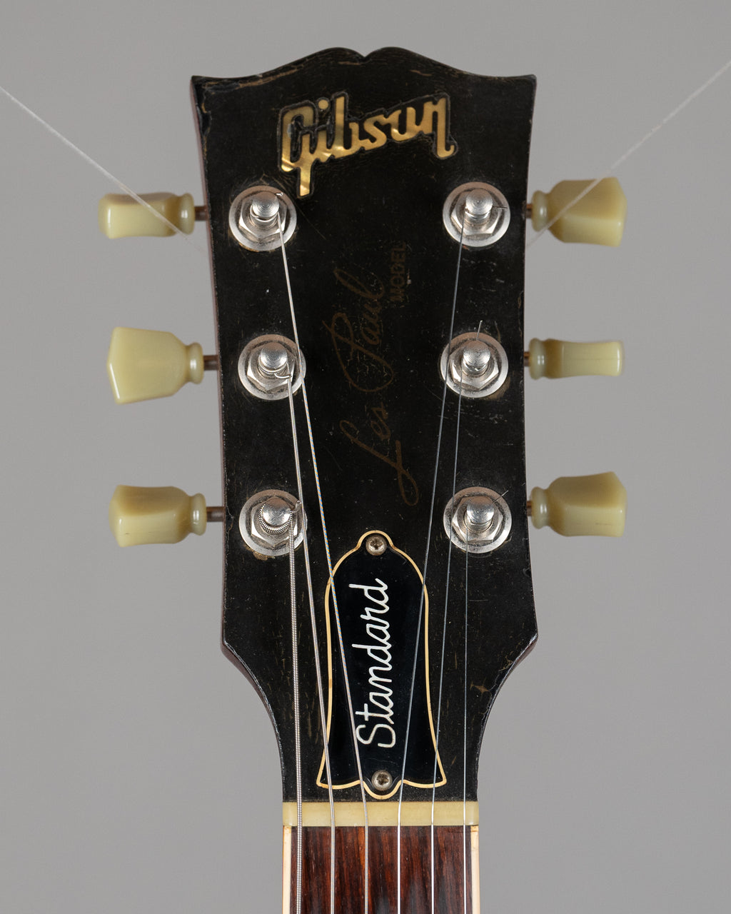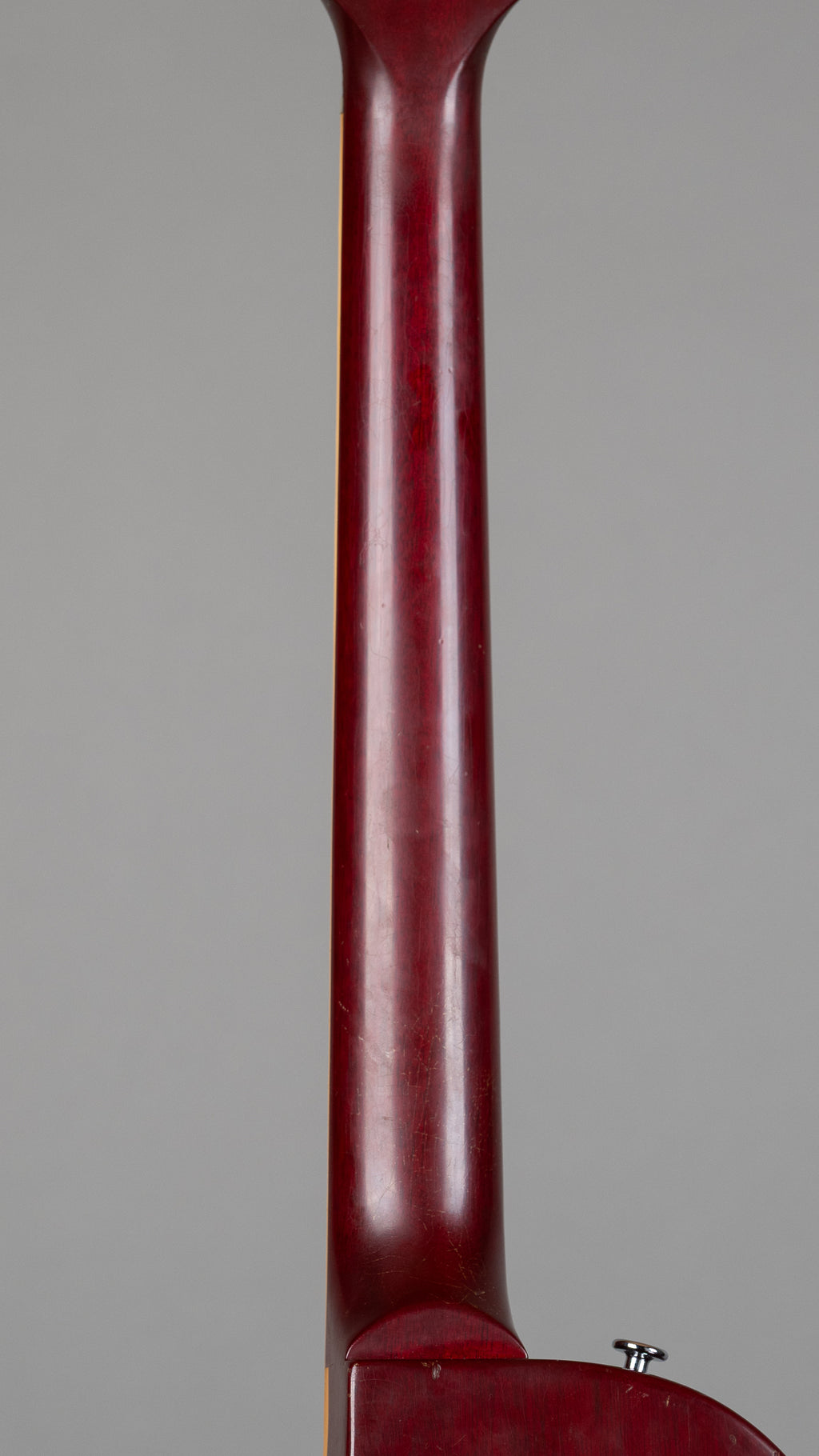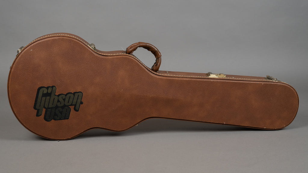 Small chip on the headstock, original frets intact with life left. Original machineheads replaced with gold grovers. Binding and plastics have faded to a lovely nicotine yellow.