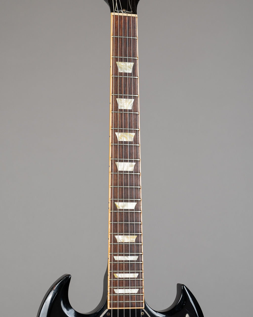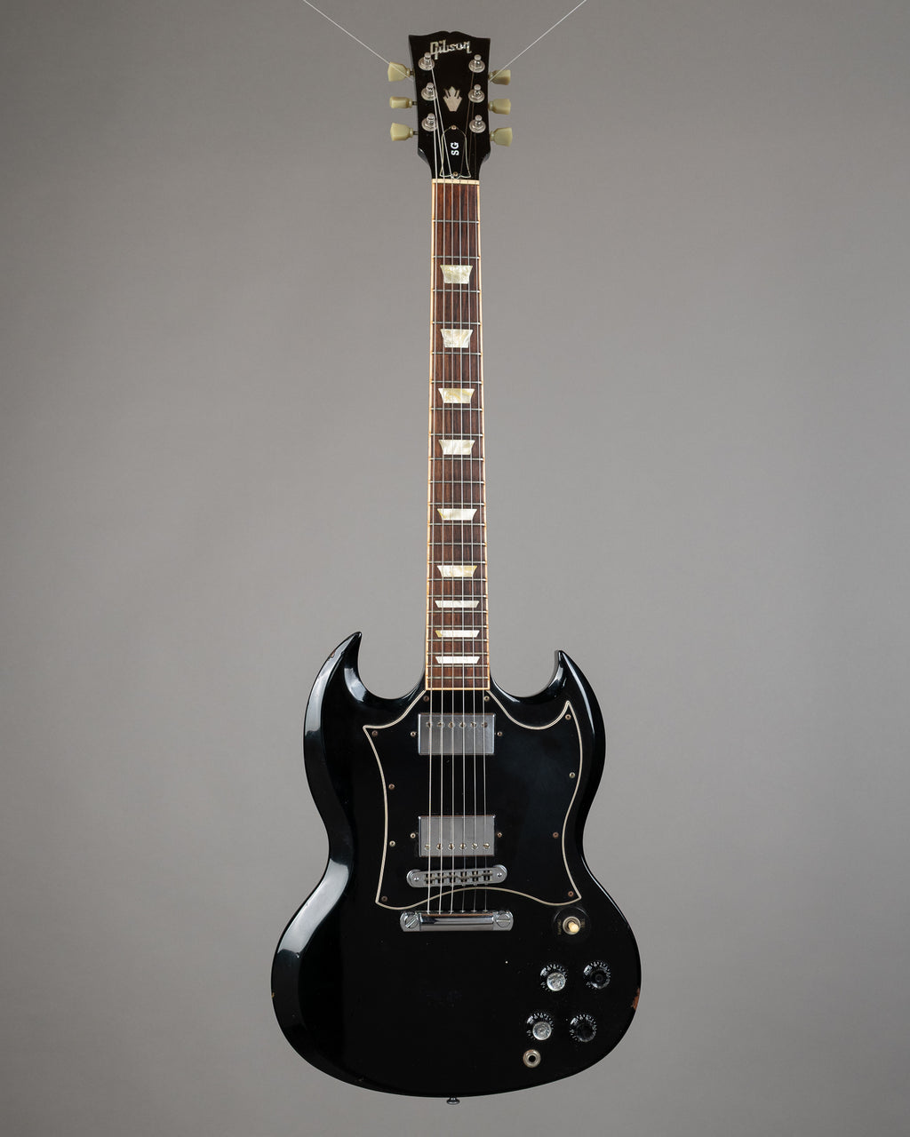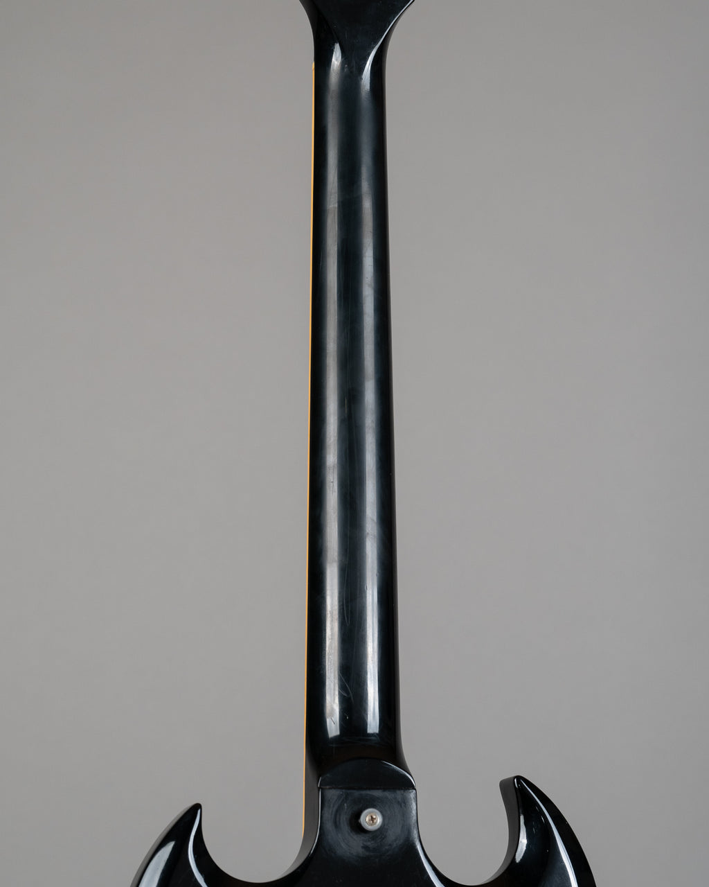 Chunky neck, joyful SG Standard in Ebony. Some signs of a mispent youth...sticker tan, dings, but it doesn't bother it, so it shouldn't bother you. Low action. slightly pitted frets that could use some attention some time in the not so distant future. Silver tops are missing off the knobs. Fun happy, but serious rock and roll times are promised with this SG..Made in the USA SN 024956024 Weight: 3.20kgs