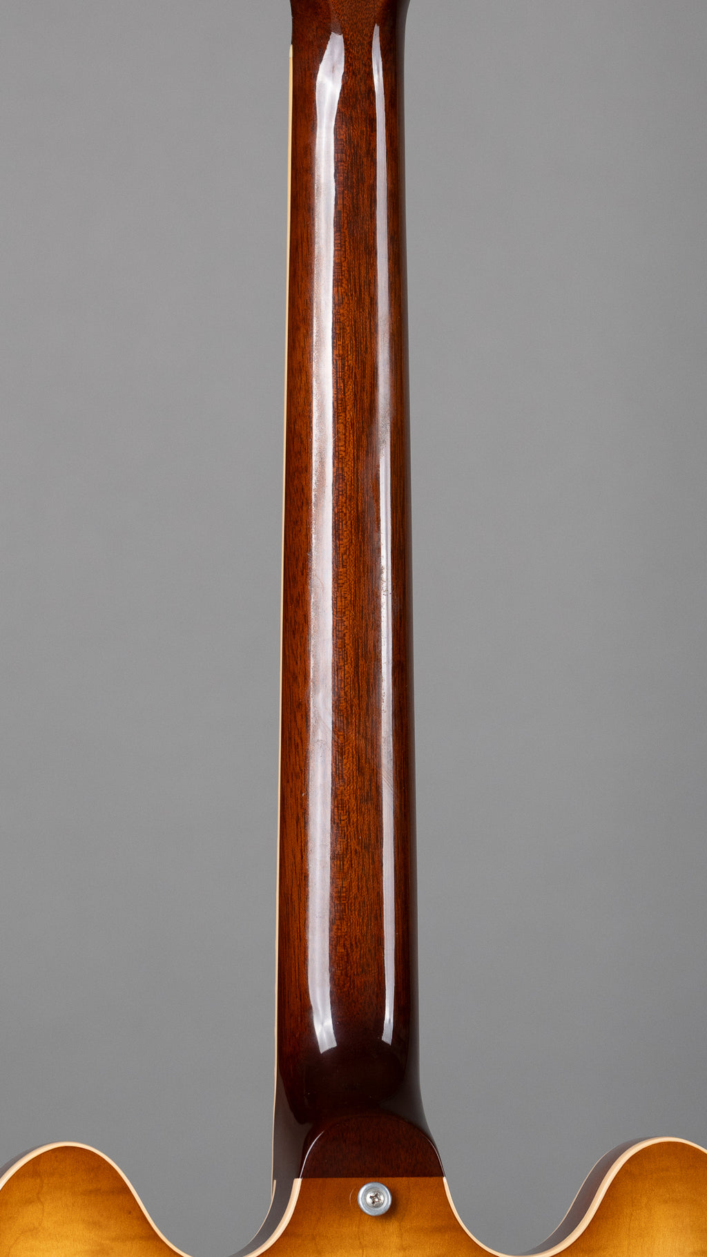 Semi-hollow laminated maple with a solid maple center block, one-piece mahogany set neck. Slim Taper, Rosewood board with single-ply cream binding. Pearloid dots for inlays. 22 medium-jumbo frets on 24.75" scale, nut width at ~1.69" as was the style at the time. Gorgeous subtle figure, flaming catches light well with some asymmetric melty grain marks that kind of look like spilled coffee on parchment. One of the good ones! No lazy bookmatching here.