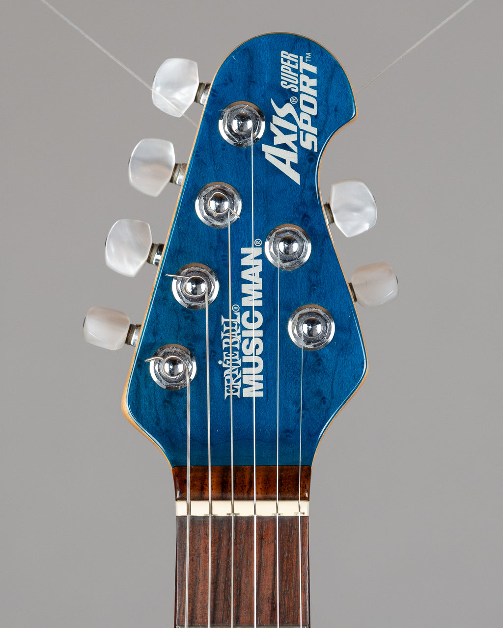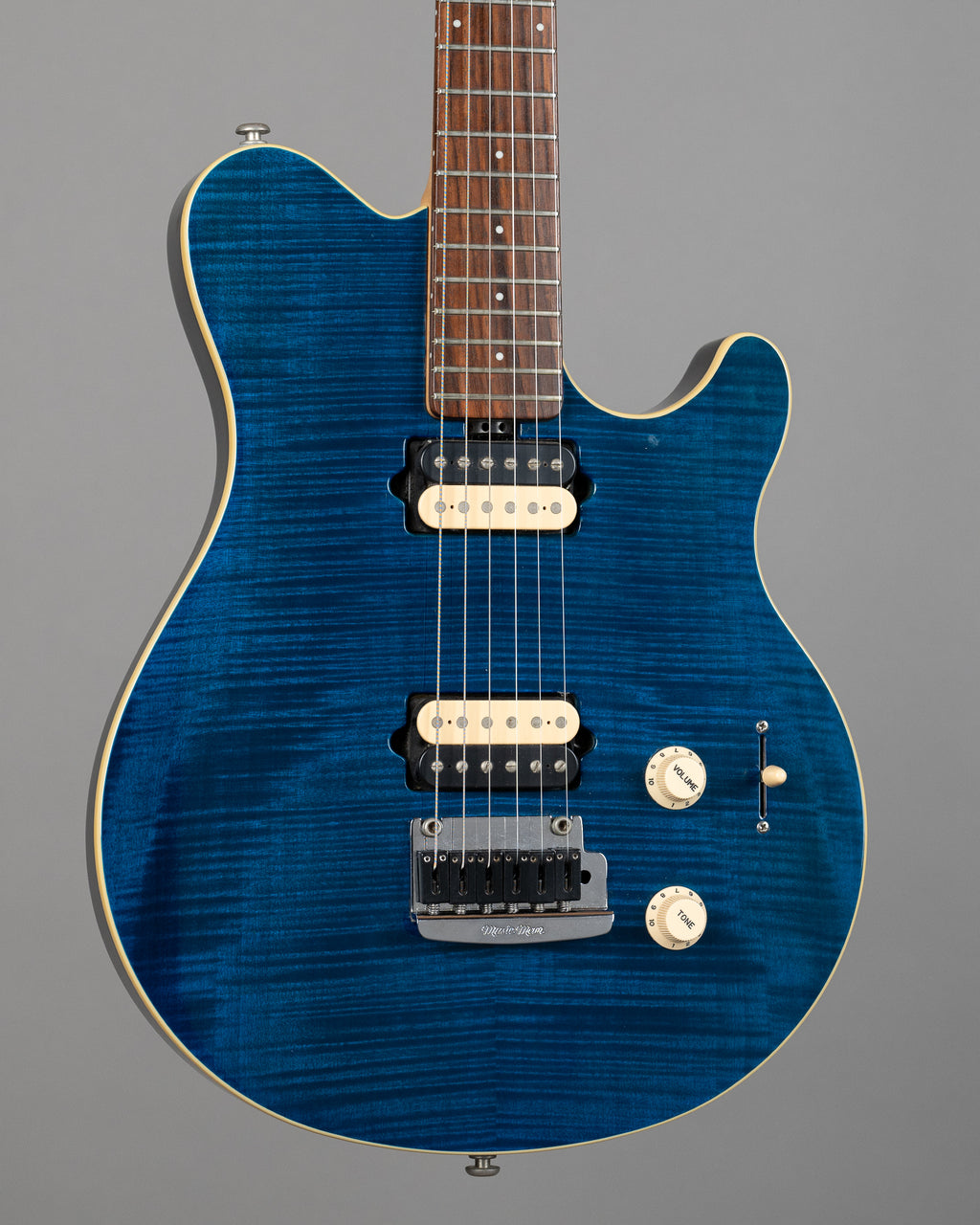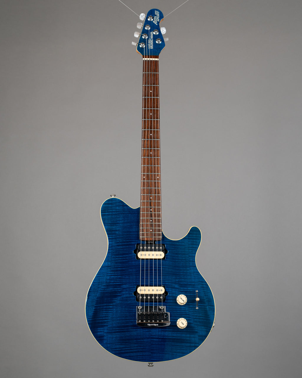 Highly spec'd USA-made Axis Super Sport with a nicely figured flame maple top under a translucent blue finish. Maple neck with rosewood fretboard and matching headstock. HH pickup layout with tremolo with a 5-way pickup selector offering both humbucker and single coil tones.