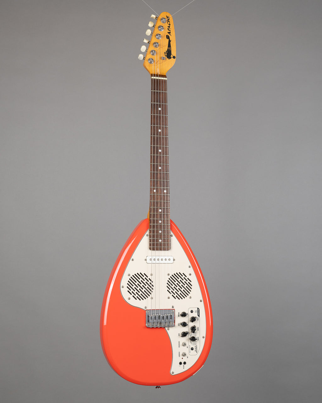 Reissue of the classic Vox Apache shape with onboard effects. Solidbody electric featuring the distinctive pentagonal body, bolt-on neck, and a compact, lightweight feel. Built in drum machine and distortion circuit - oh and a built in speaker! A lot of fun both plugged into an amp or using the in built speaker.