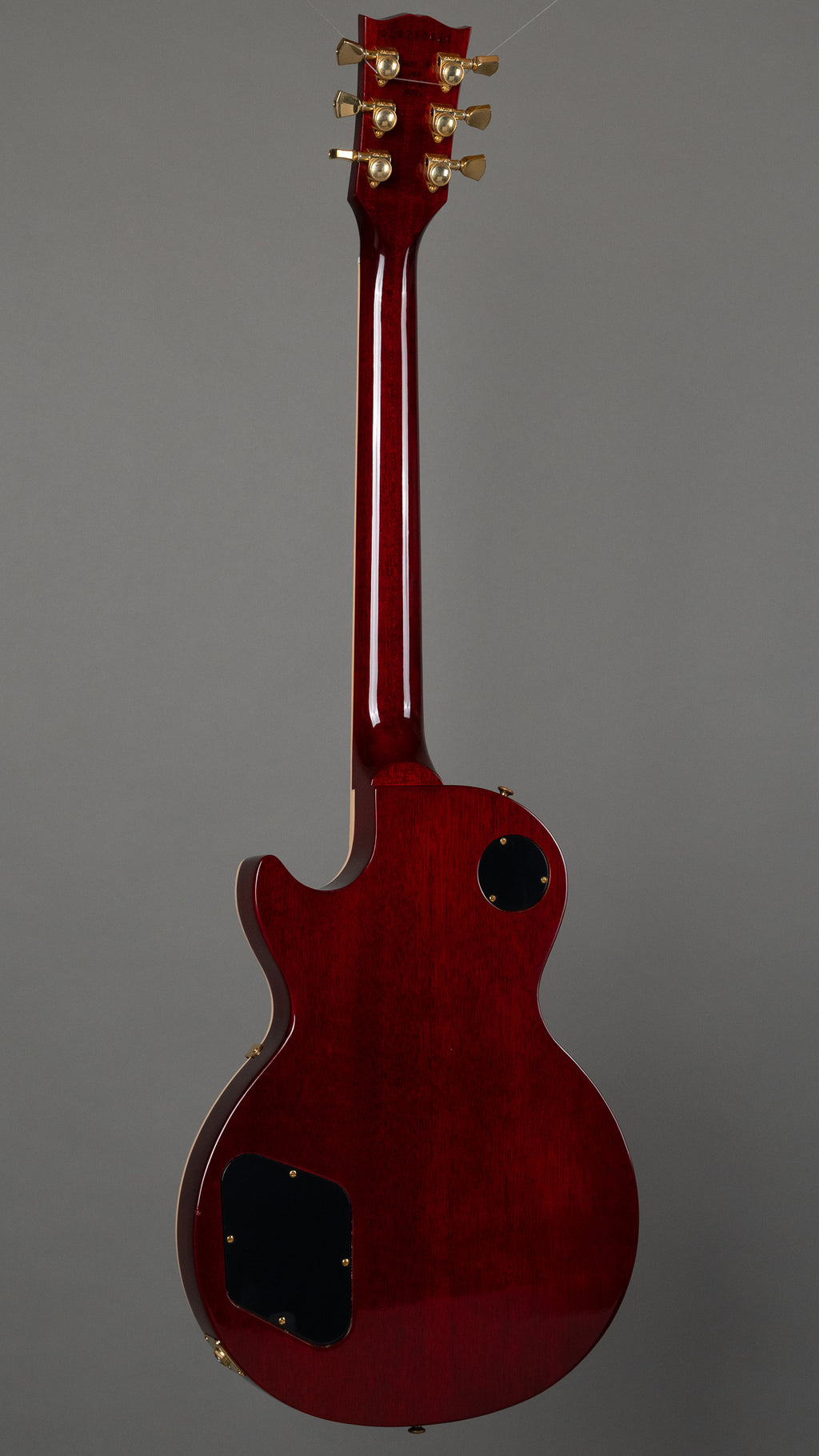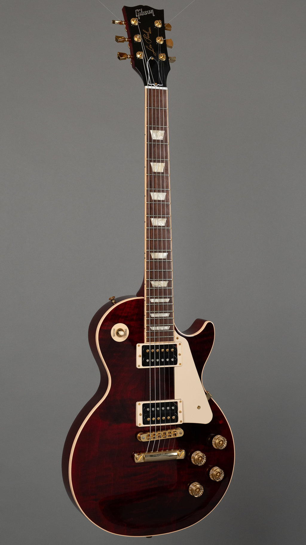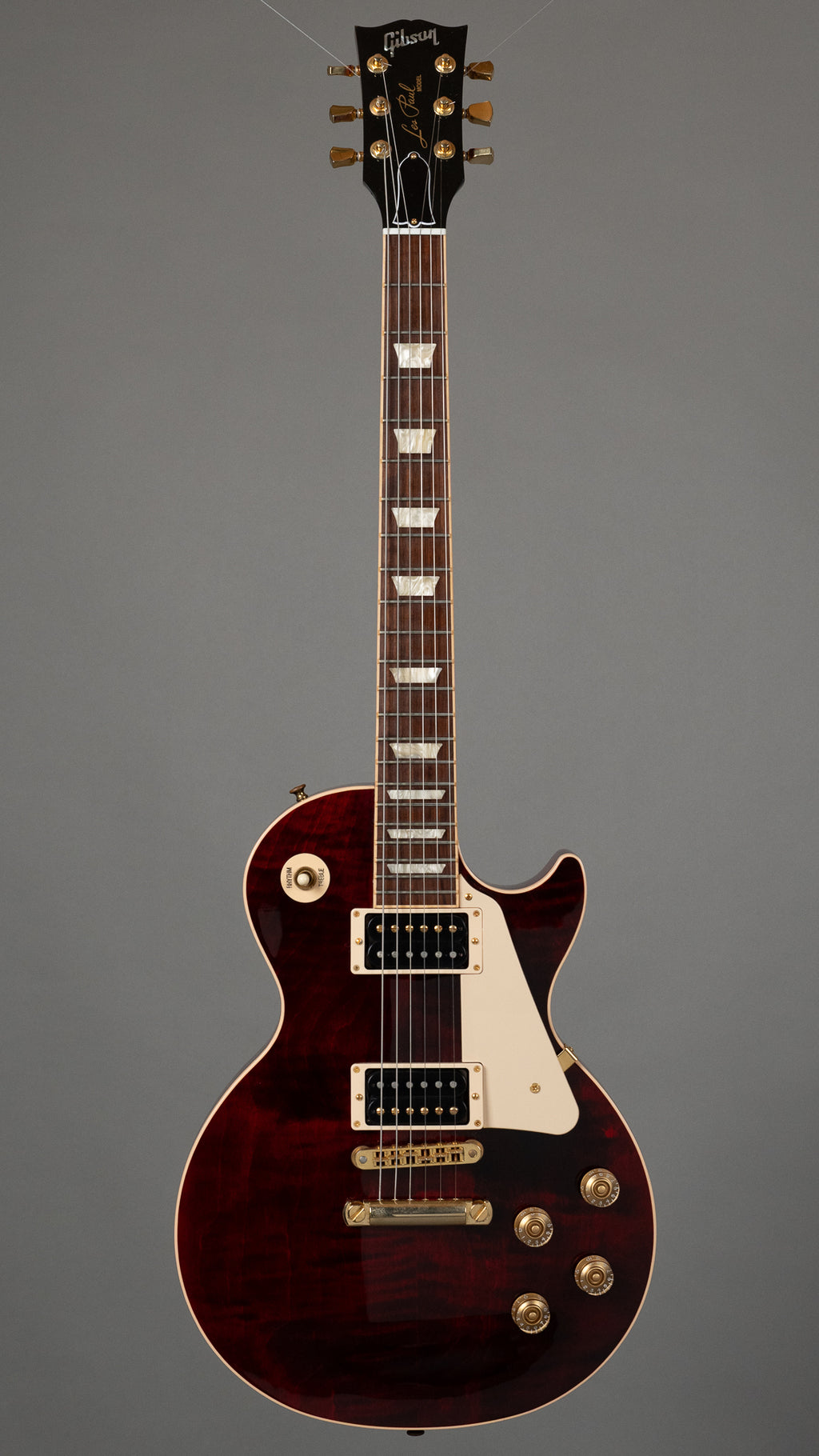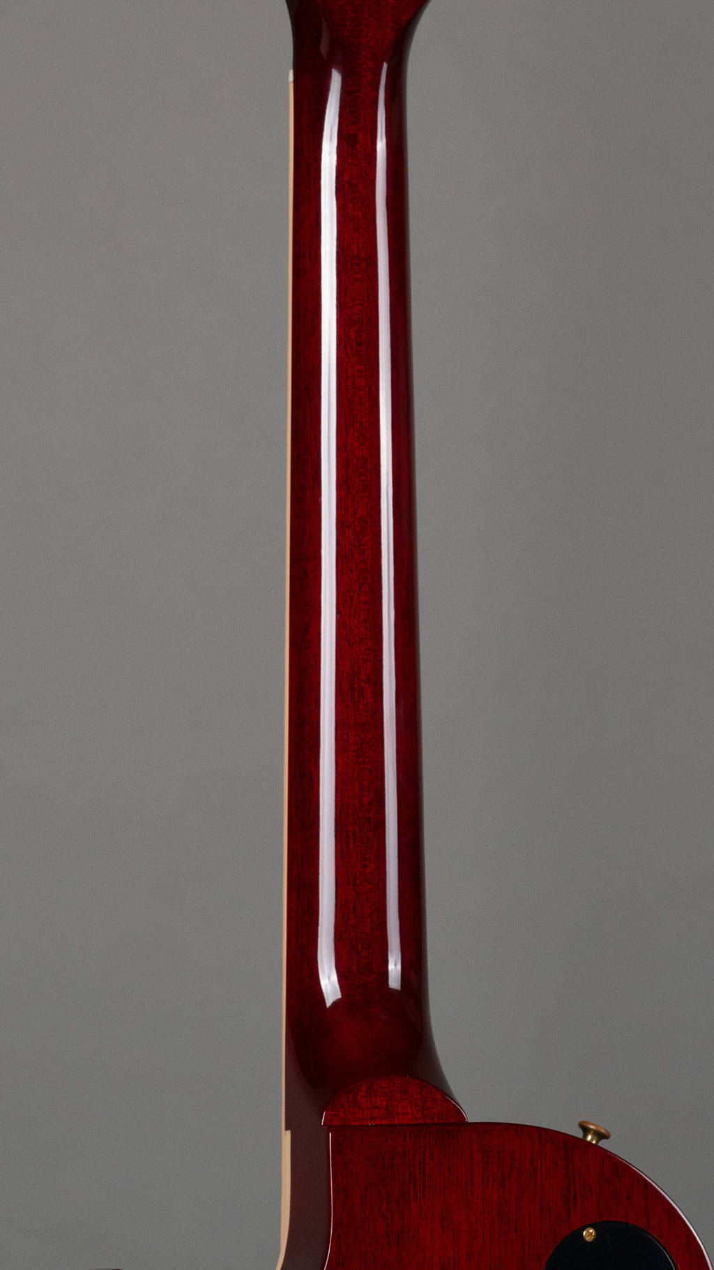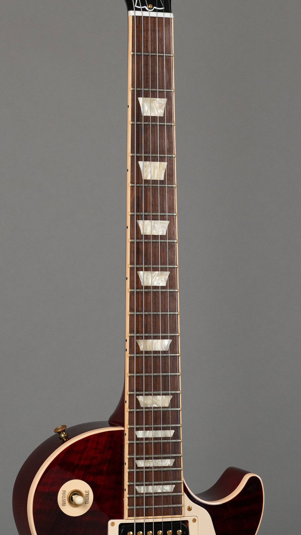 Mahogany body with the "modern" weight relief, transparent maple top with some very fetching figure, set-in mahogany neck w/ slim taper profile, 22 frets on the rosewood board w/ trapeze inlays. Twin Burstbucker Pro humbuckers, from warm and creamy to sharp and punchy, with push/pull coil tap on the volume control. Graph Tech nut and Vintage Deluxe locking machine heads with Keystone buttons.