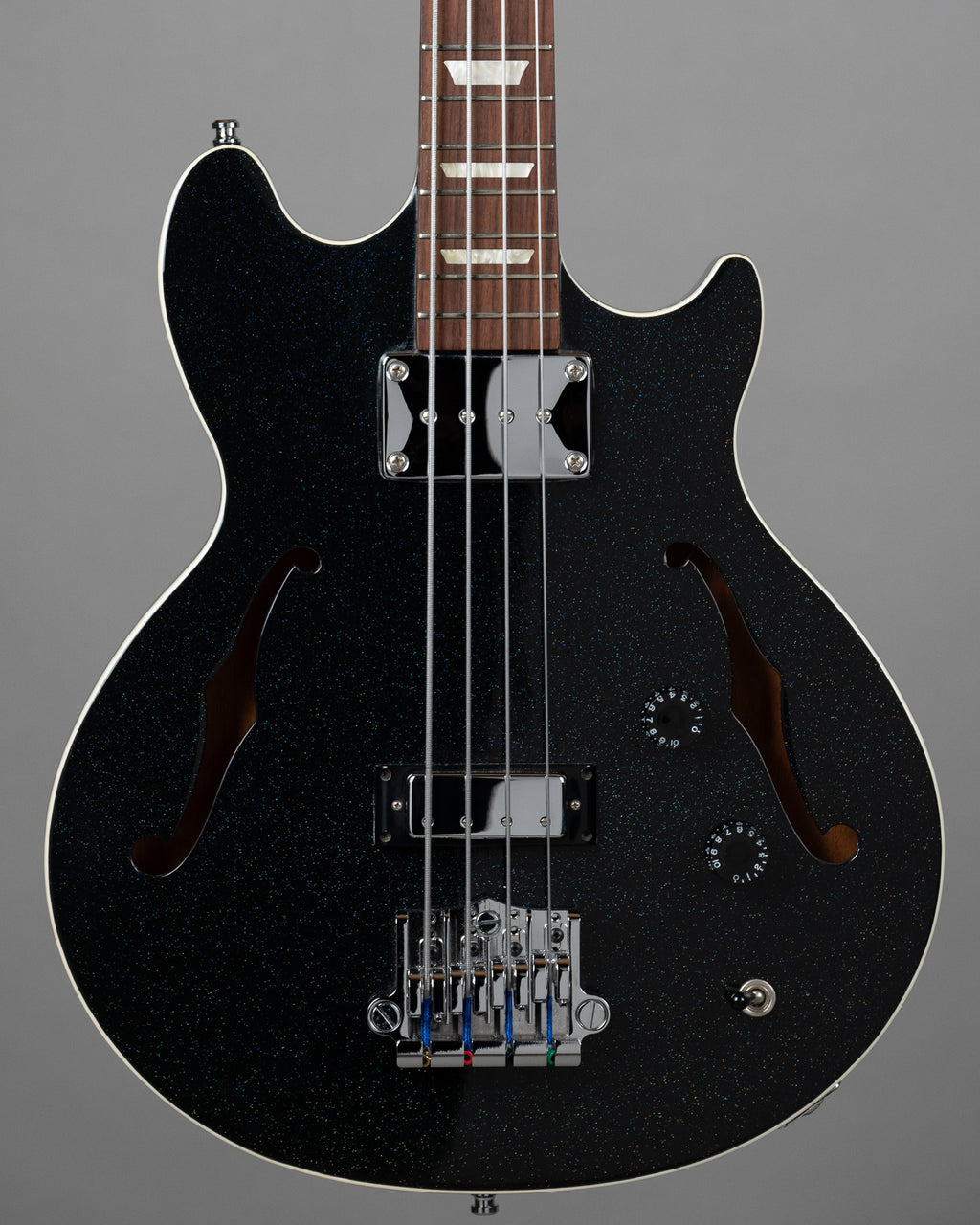 The bridge has been upgraded to a Babicz high mass bridge (tick), and it's currently strung up with flatwounds (doubletick).