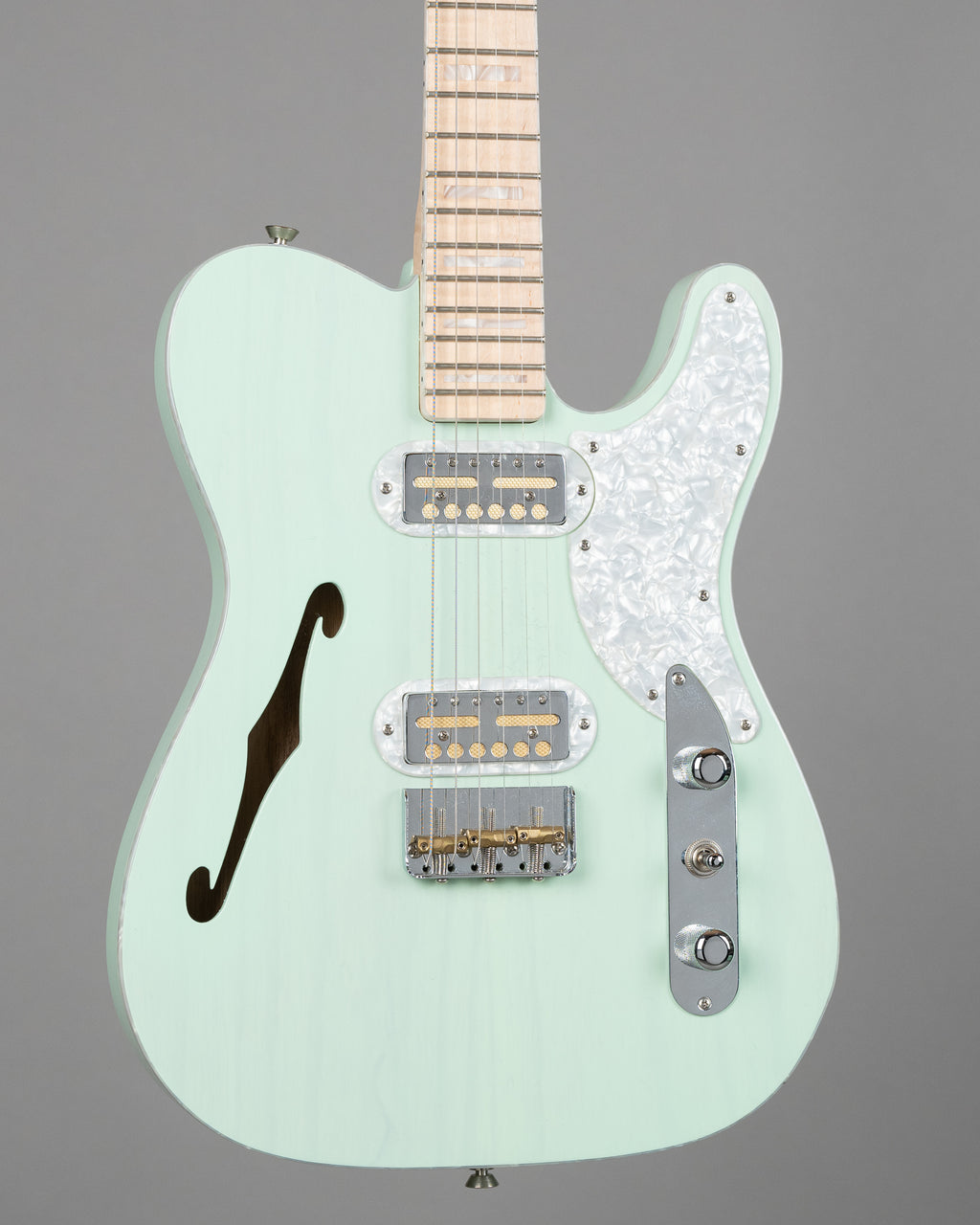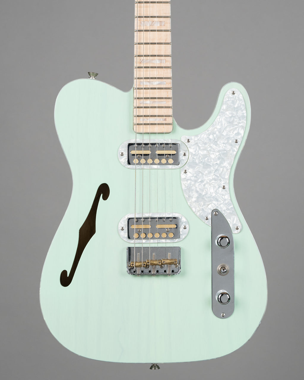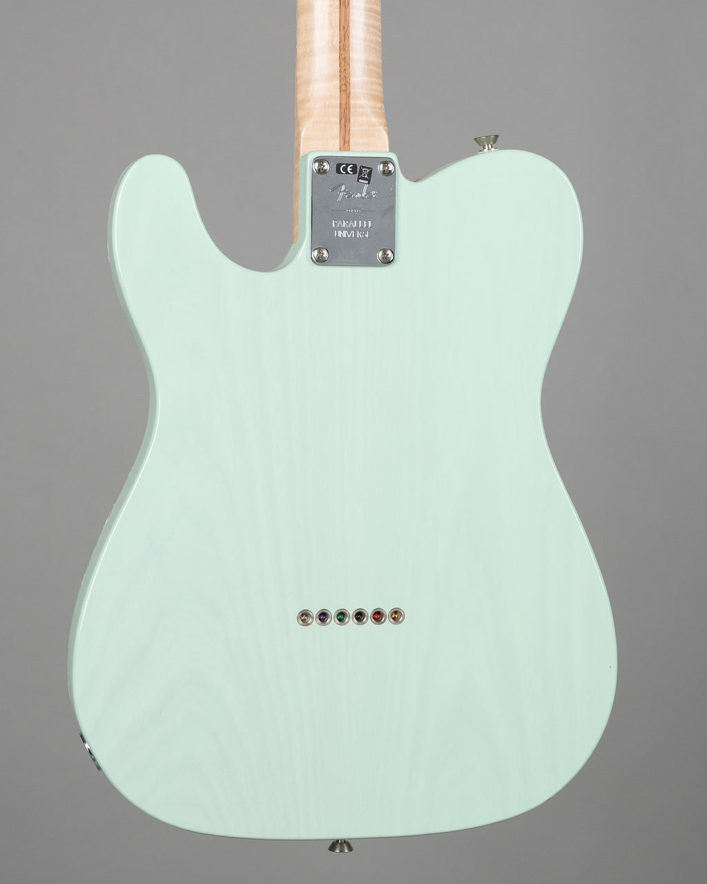 The neck is flame maple and the Thinline swamp ash body is accentuated by the Trans Daphne Blue or Trans Surf Green gloss finish choices in a twist on classic Fender color conventions. Two custom-designed Fender Gold Foil pickups deliver crystalline highs, expressive mids and creamy lows. The "cut" 3-saddle Tele bridge delivers classic Tele tone and feel despite its stylishly sleek silhouette.