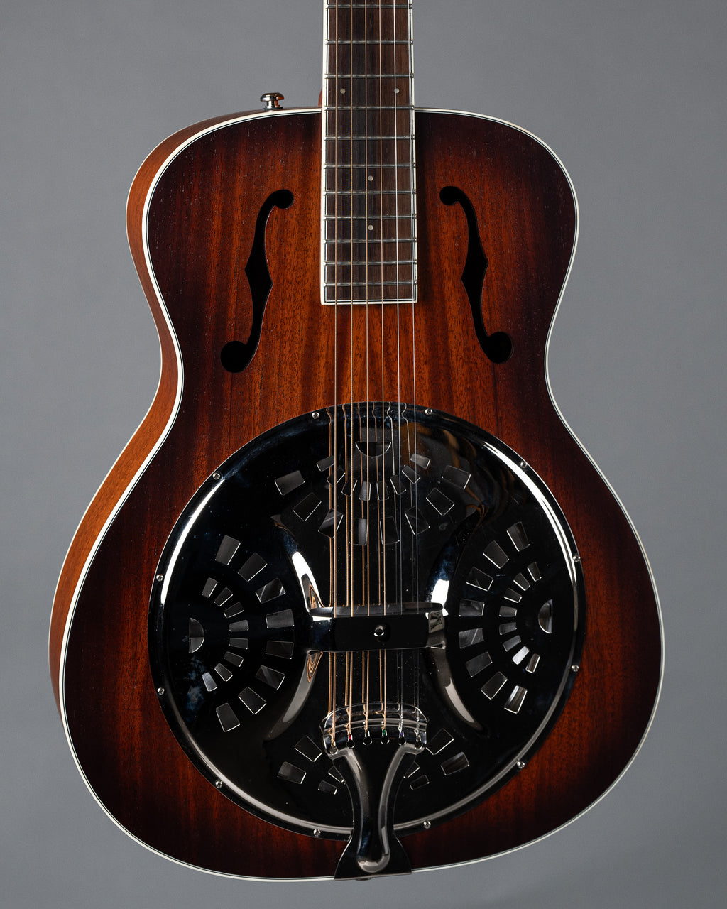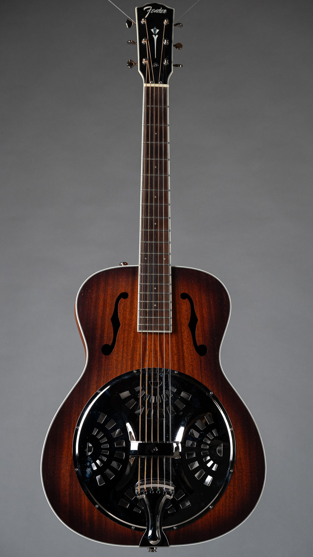Modern Fender take on the biscuit-bridge resonator, dressed up in Aged Cognac Burst with bound mahogany body and tasteful deco vibes. Loud, woody and punchy through the cone. Comes with its original hard case.