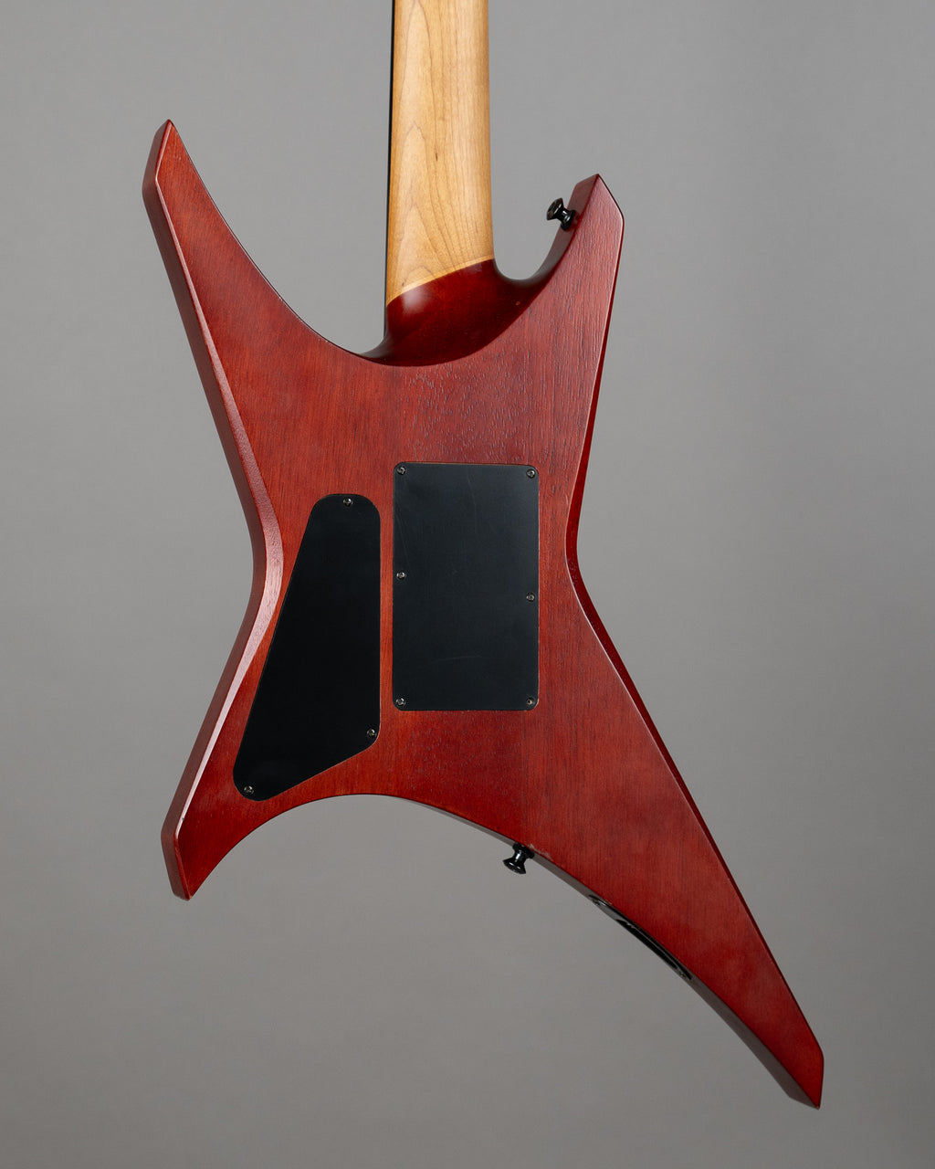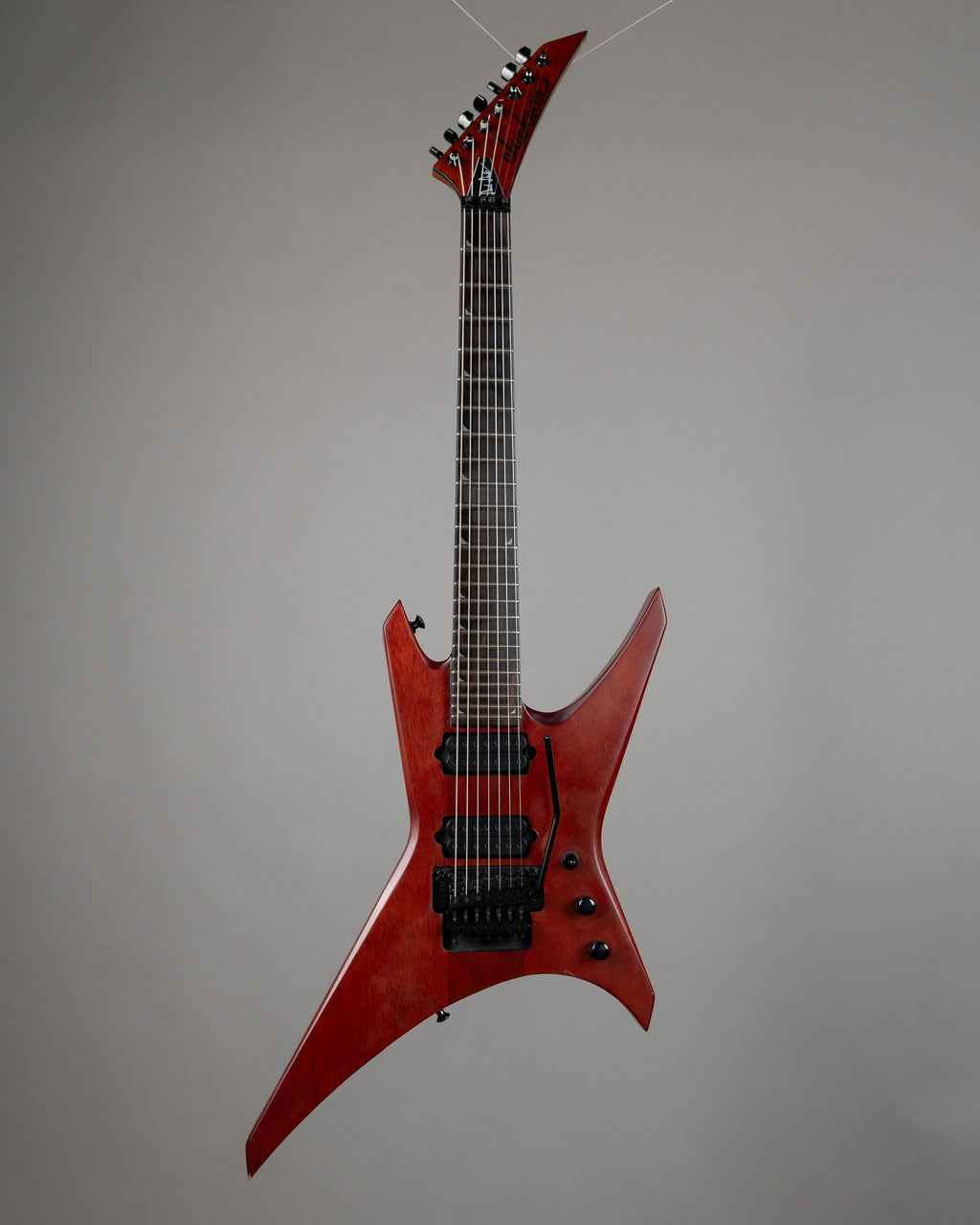 A sharp-edged 7-string designed for technical metal playing, the WR7 features a 25.5" scale, mahogany body, and a through-body maple neck with graphite reinforcement and oiled finish for smooth feel and stability. The ebony fingerboard has a 12"-16" compound radius with 24 jumbo frets for fast, precise playing. Loaded with DiMarzio Imperium pickups—custom-voiced for Dave Davidson—this guitar delivers tight, articulate tone from high-gain riffing to clean, complex chord voicings. Controls include a 3-way toggle, single tone, and push/pull volume for coil-split versatility. Finished in Walnut Stain with matching headstock, it features a recessed Floyd Rose 1000 Series tremolo, Dunlop dual-lock strap buttons, and black hardware throughout. Crafted in Indonesia. Serial ISJ2213429. Weighs virtually nothing at 3.3kg