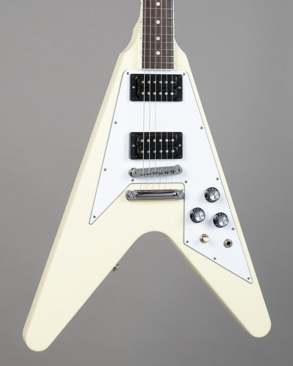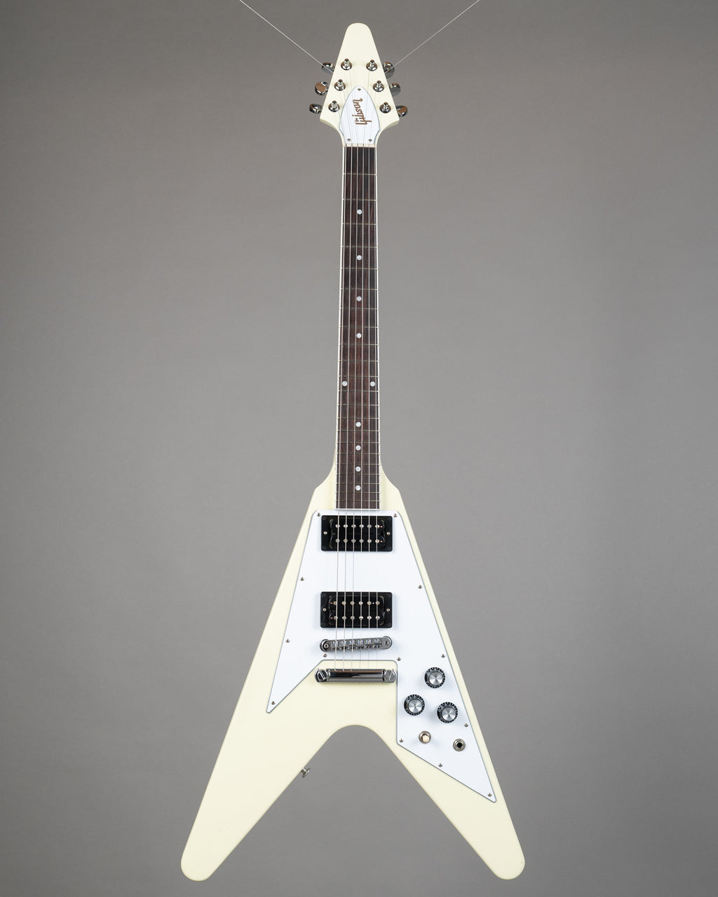 'The iconic 70s classic is ready to take flight again. With its bound rosewood fingerboard, SlimTaper™ neck, and a pair of uncovered 70s Tribute humbuckers™ hand-wired with Orange Drop® capacitors, this Flying V™ is set to nail all of the classic tones of the era. The iconic body shape and distinctive headstock, silver reflector knobs, and chrome hardware make this guitar ready to rock any arena stage'