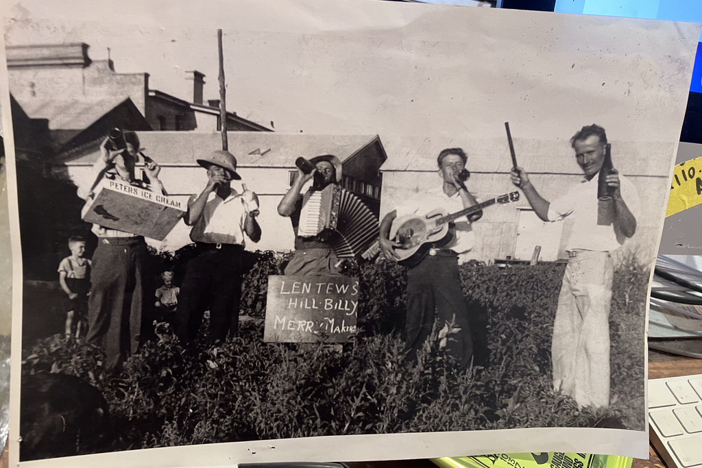 Comes with an SKB case and a pic of the 'Lentews Hillbilly Merry Makers' sucking on some longnecks and doing what they do best..The guitar player is sporting this very guitar in the photo..and that's as much provinence as you are likely to get.