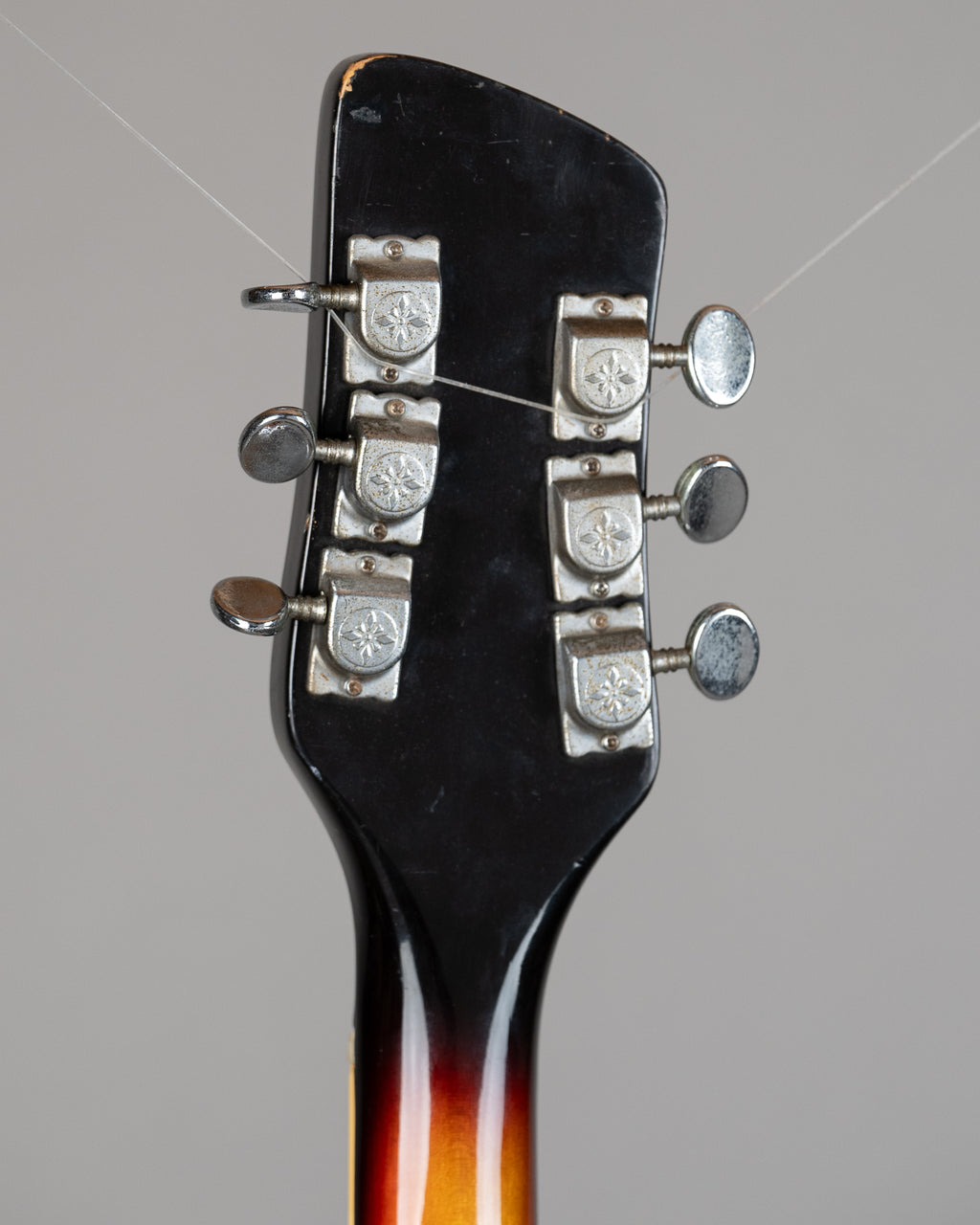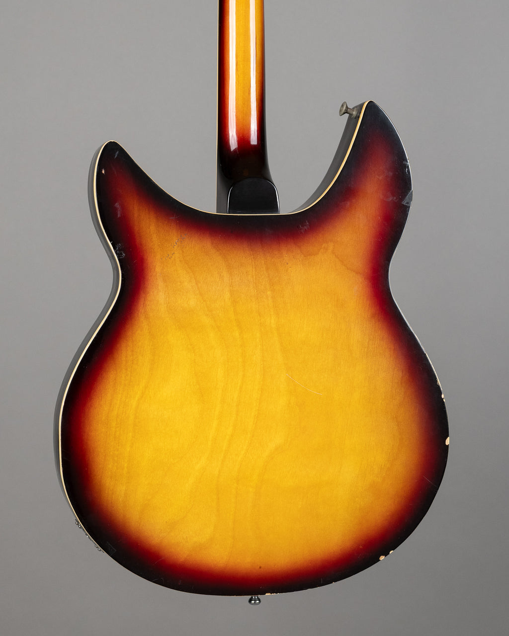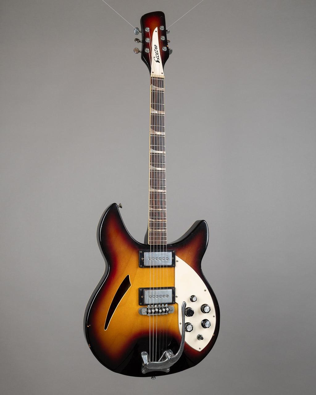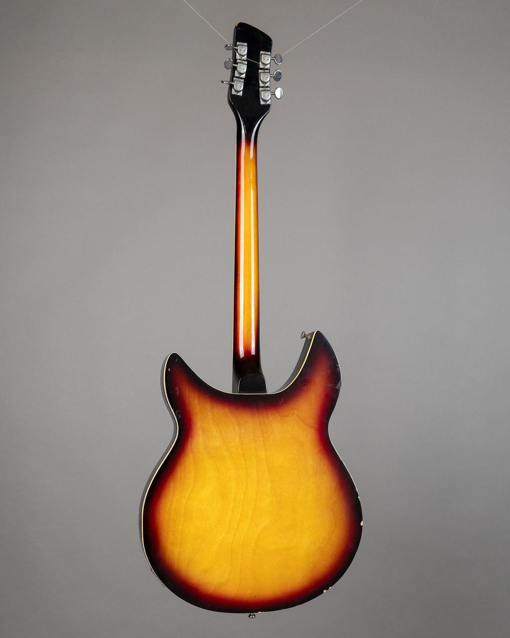 Rare Rickenbacker copy made by ex Teisco employees in the late 60s. Not something that bobs up every day, and definitely more Rickenbacker than many of the copies you see out there. Two low output pickups each with volume and tone. There is a little bit of binding missing around the F on the low E string side (if that makes sense), and a few dings here and there. Frets are low and flat, but plug it in and it has quite a unique sound. It's rough, it's ready..it's cooler than the rest, it's the best. Made in Japan. SN 80313 Weight: 3.6 kg