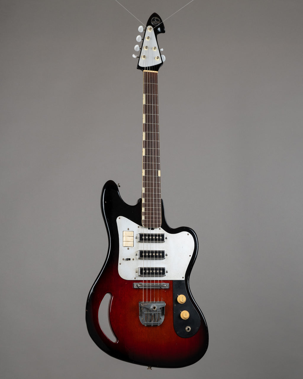 Nice playing TG-64. These early Teiscos have charm out the waazoo. Three individual rocker switches controlling the operation of a trio of nasty sounding single coils. Tremolo is missing its arm and cover but work well as a hardtail setup. Neck has a mild twist to the treble side but plays plenty fine with the truss rod have lots of room for adjustment either way. Knobs have been switched out with an aged pair of strat style units. A cool thing. Come to the wildside!