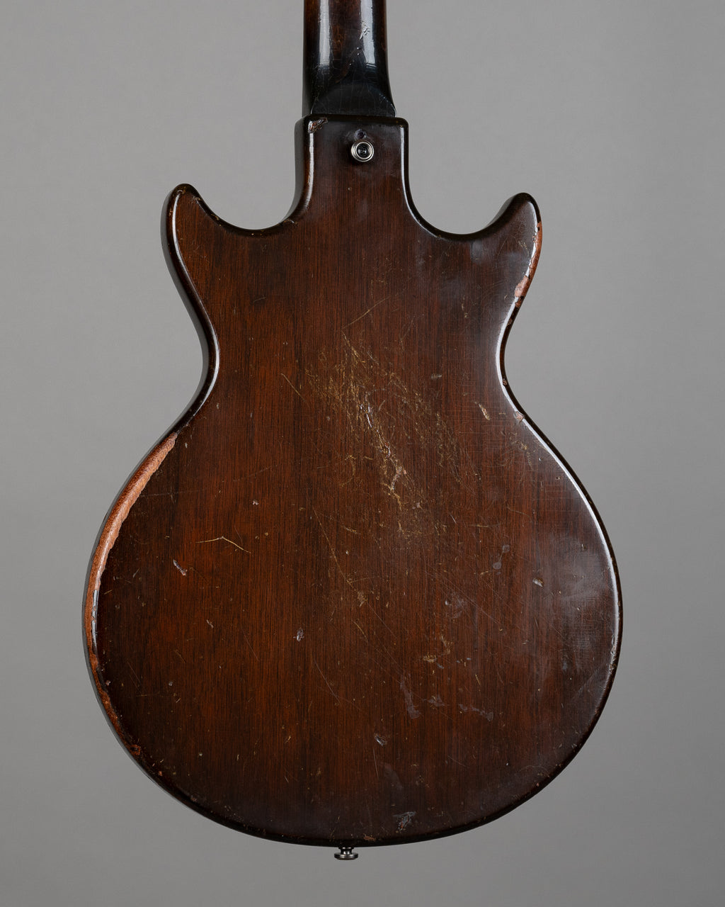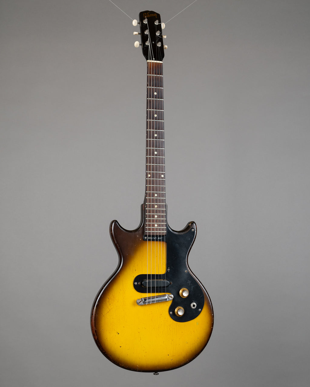 This is a rock and roll guitar. It has a pickup, it has a headstock repair that is rough but functional. At 3K it is no where near going to blow the bank..especially for a vintage Gibbo. Bridge changed, strap pins changed (one small hole remains near the back strap pin...new vintage style tuners, pots changed too. Frets are low and flat.. This guitar is a bit Carl Barat if you will, definitely a guitar for a Libertine. Serial number is under the paint..Weight is a very light 2.60kgs.