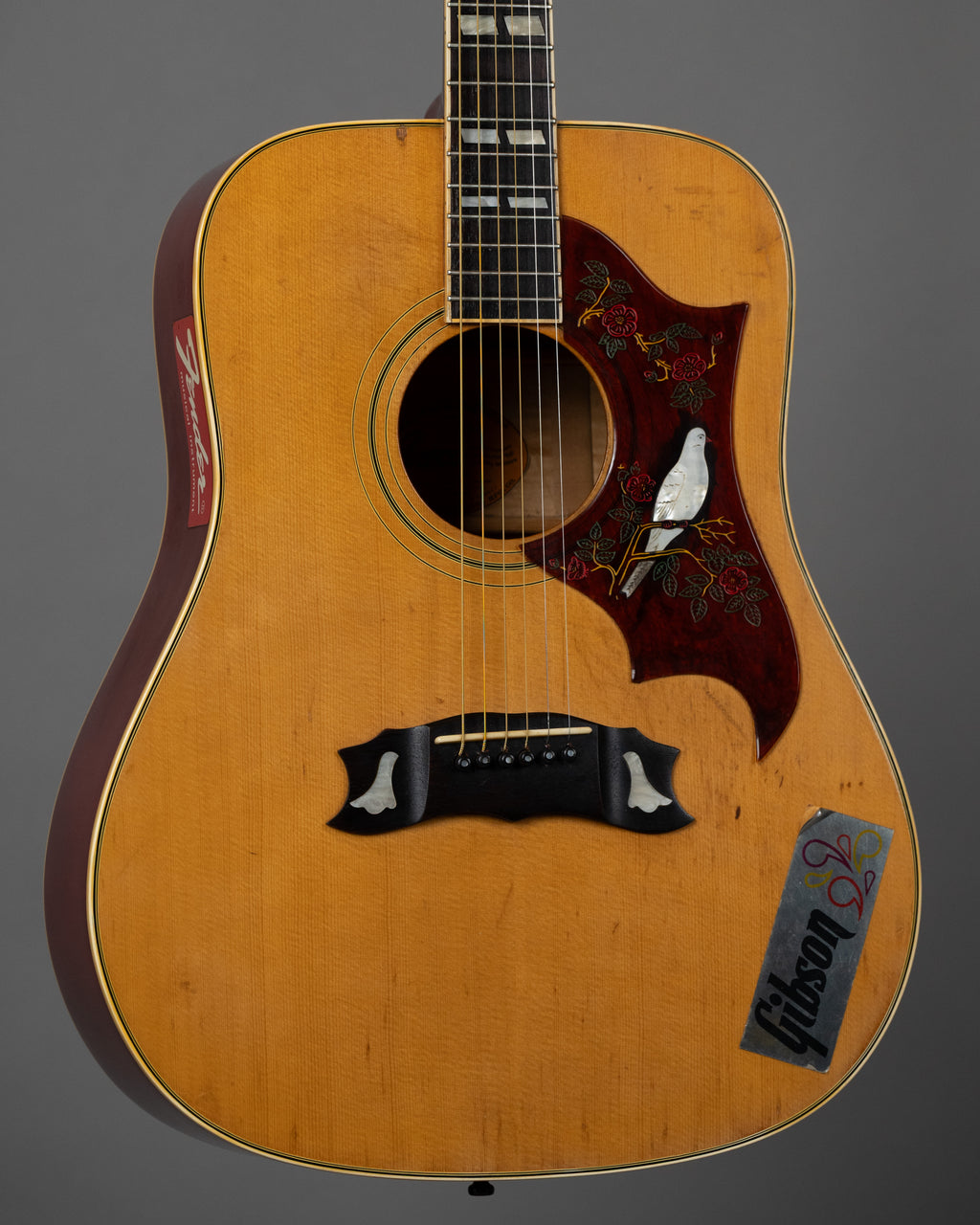It's lived a life, somewhere, and now ready for a sea change. How's it sound? Damn fine - like 75% Gibson Dove at a 1/8th of the price. Straight up maple back and sides, and spruce top. The little birdie looks so cute on the pickguard. Looks a bit like the 'John Cougar' guitar. Frets are very low, has stickers on it with tan line under 'em, one saying Gibson, one saying Fender...see no hard feelings, ve are all friends now. If you're looking for a vibey, cool sounding, 70s made acoustic, this might just do the trick for you. It's good, it could be made great, but at this price you have enough in the tank to give it the love it needs. My first lawsuit..by Mattel.