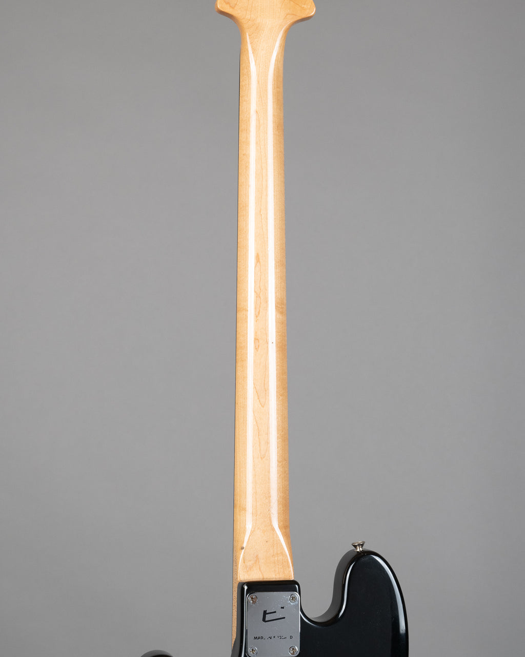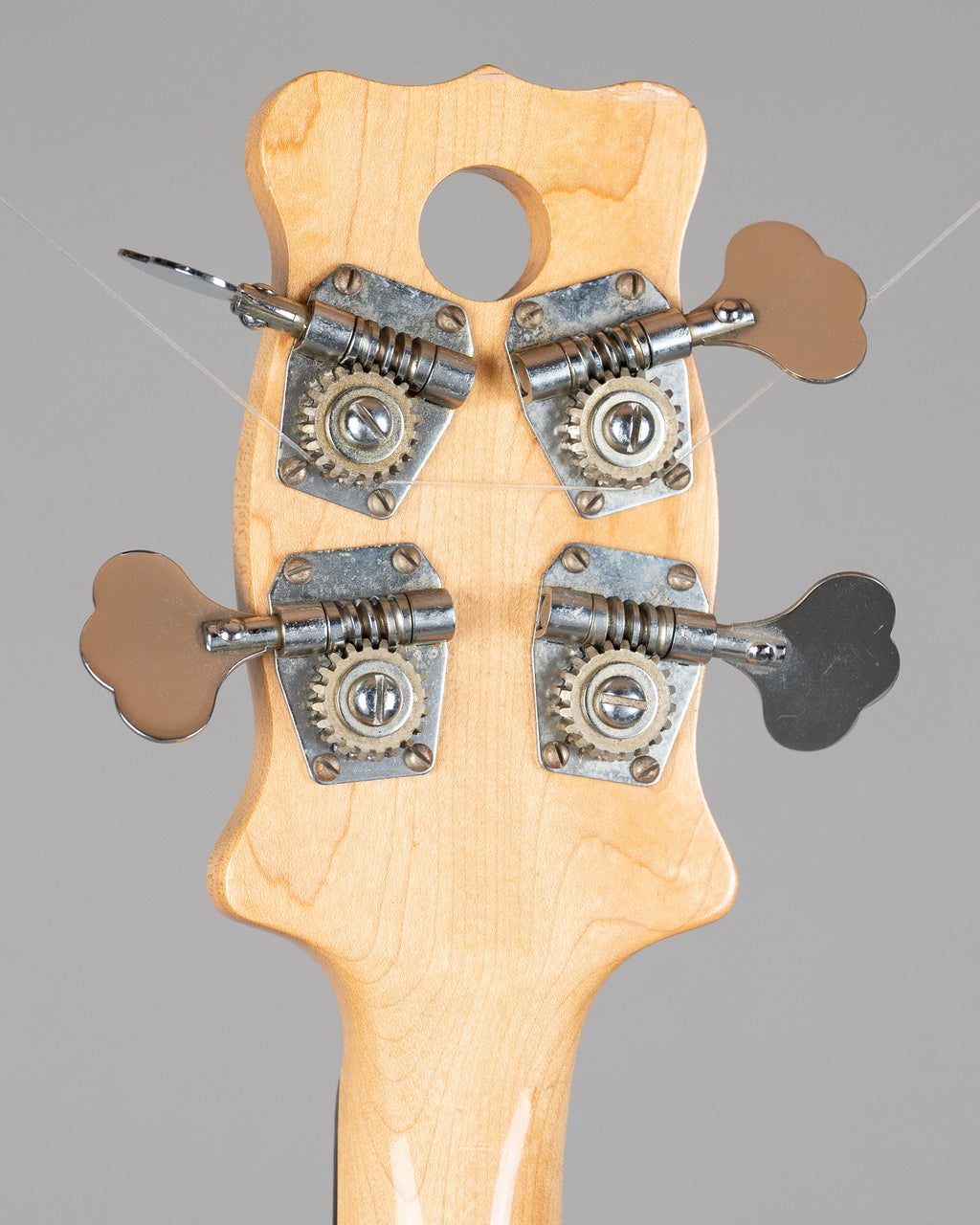 c1970s Hayman 40/40 Bass in black. England made and a bit of a cult piece. Clear acrylic guard and control plates, twin pickups under those big smoked covers and the classic Hayman badge down the side. Maple neck with plenty of honest wear and a headstock shape that only the 70s could dream up.