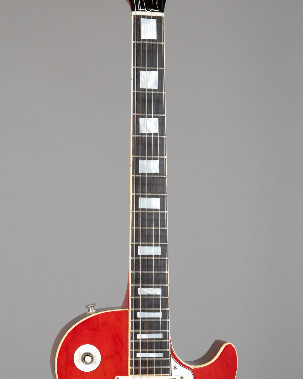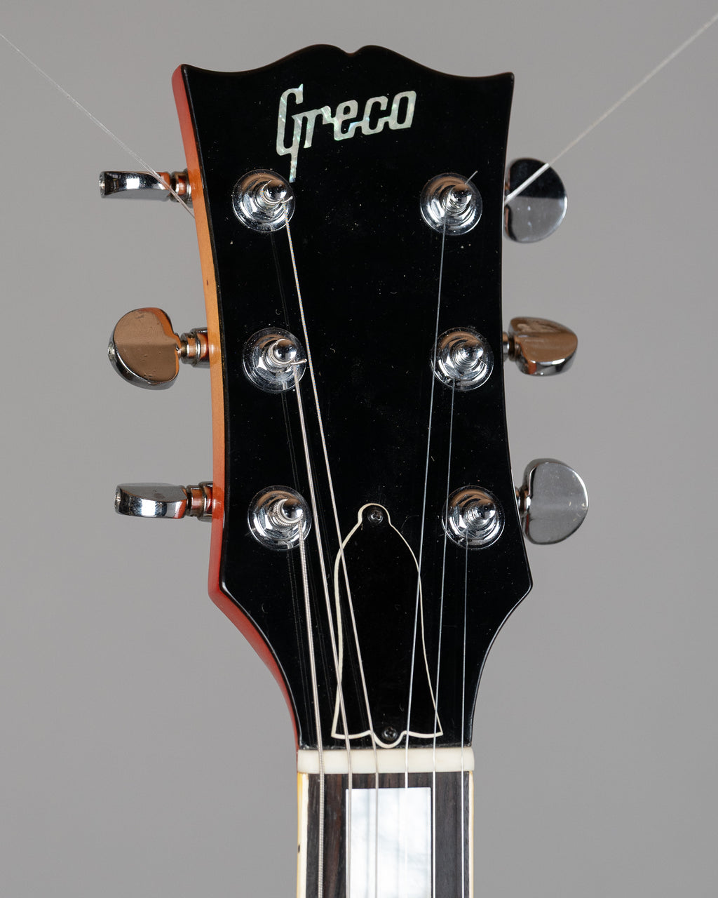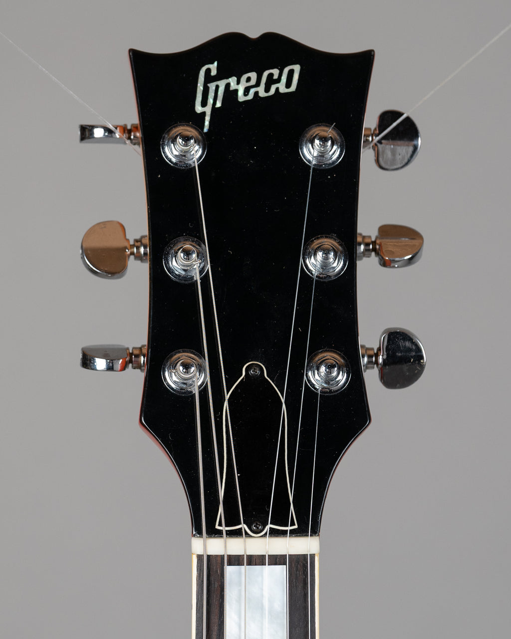 Mid 1970s Greco 'LP style' with the oddball belly contour thing going on. Set neck too, which you don’t see much on these early ones. Has those mid-rangey classic Japanese buckers you spot on the bolt-on versions, but the whole vibe here feels a step up. Plays solid, feels broken in without being flogged, and the condition is genuinely tidy for its age. Fret edge binding. Some tarnish to the chrome parts. Comes in a very period aluminium-edged Japanese case from the 70s that suits it perfectly.