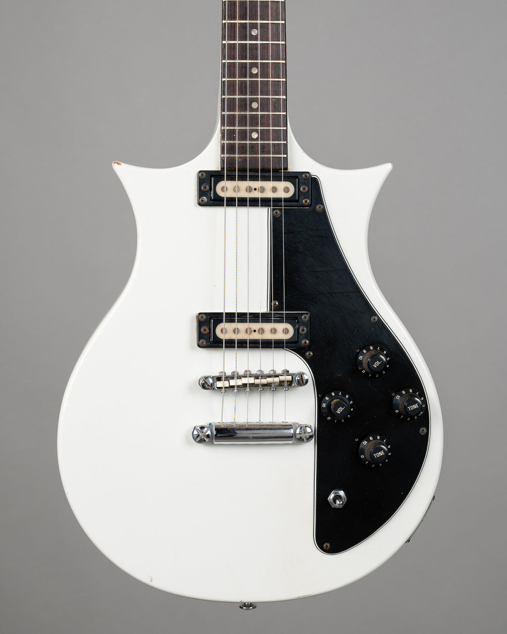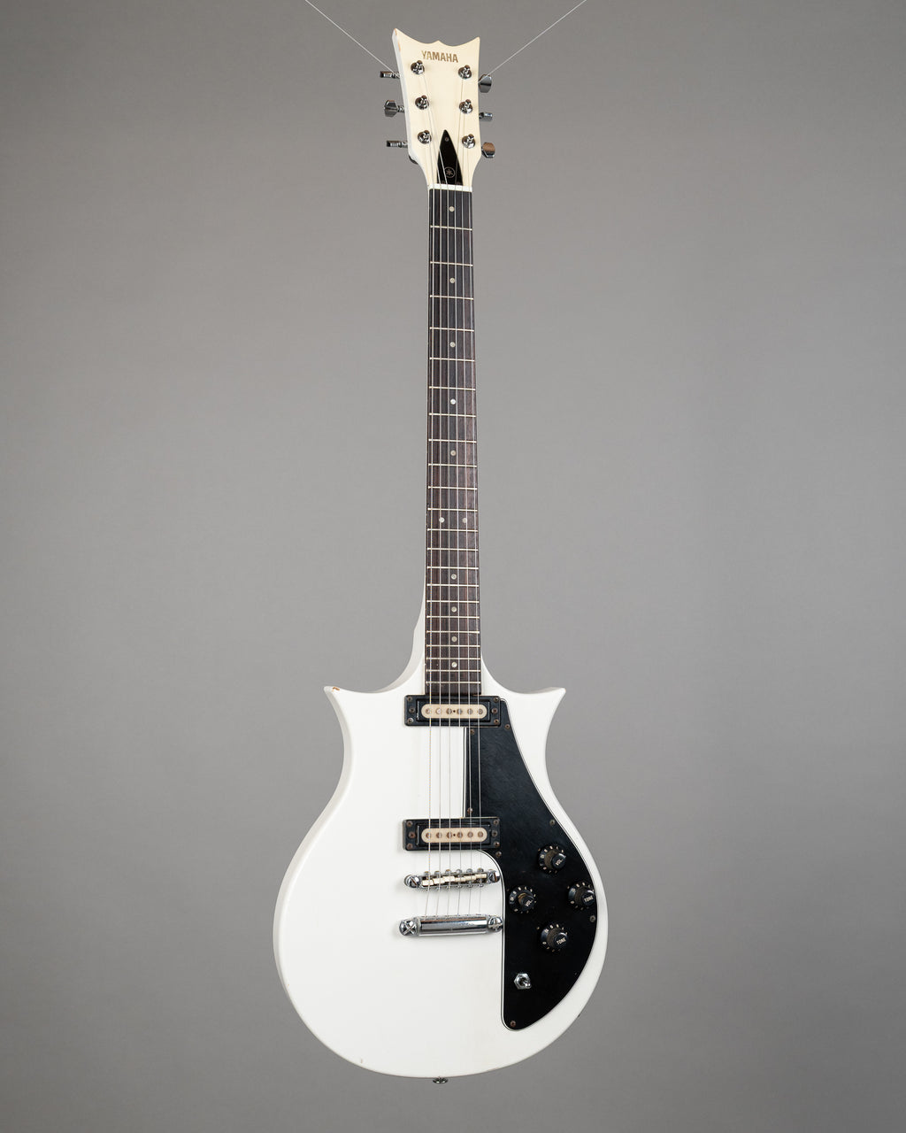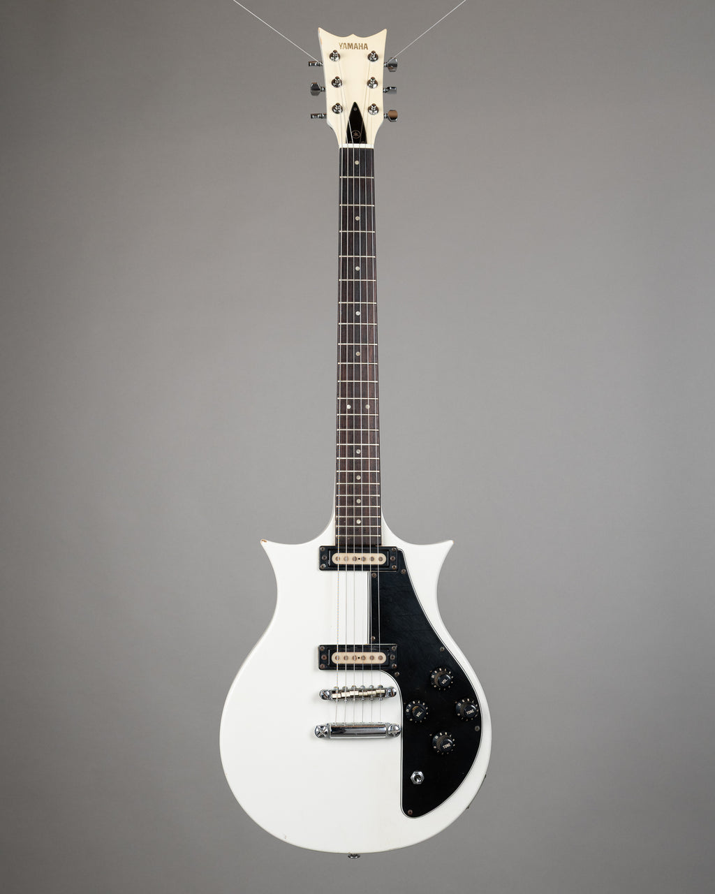 Rare as hell Yamaha SX-80 with the original case too. Not only is this a rare model, it is also extremely hard to find in this colour. Tommy Bolin used the SX-80 with Deep Purple, and I think that Carlos Santana may have looked at one once. 2 single coils, switch, volume, tone, volume, tone...does it get any simpler. Overall in very good condition, white still pops, and looks a million dollars in the yellow lined original case. Tuners have been changed SN 32851 Weight: 3.05kgs