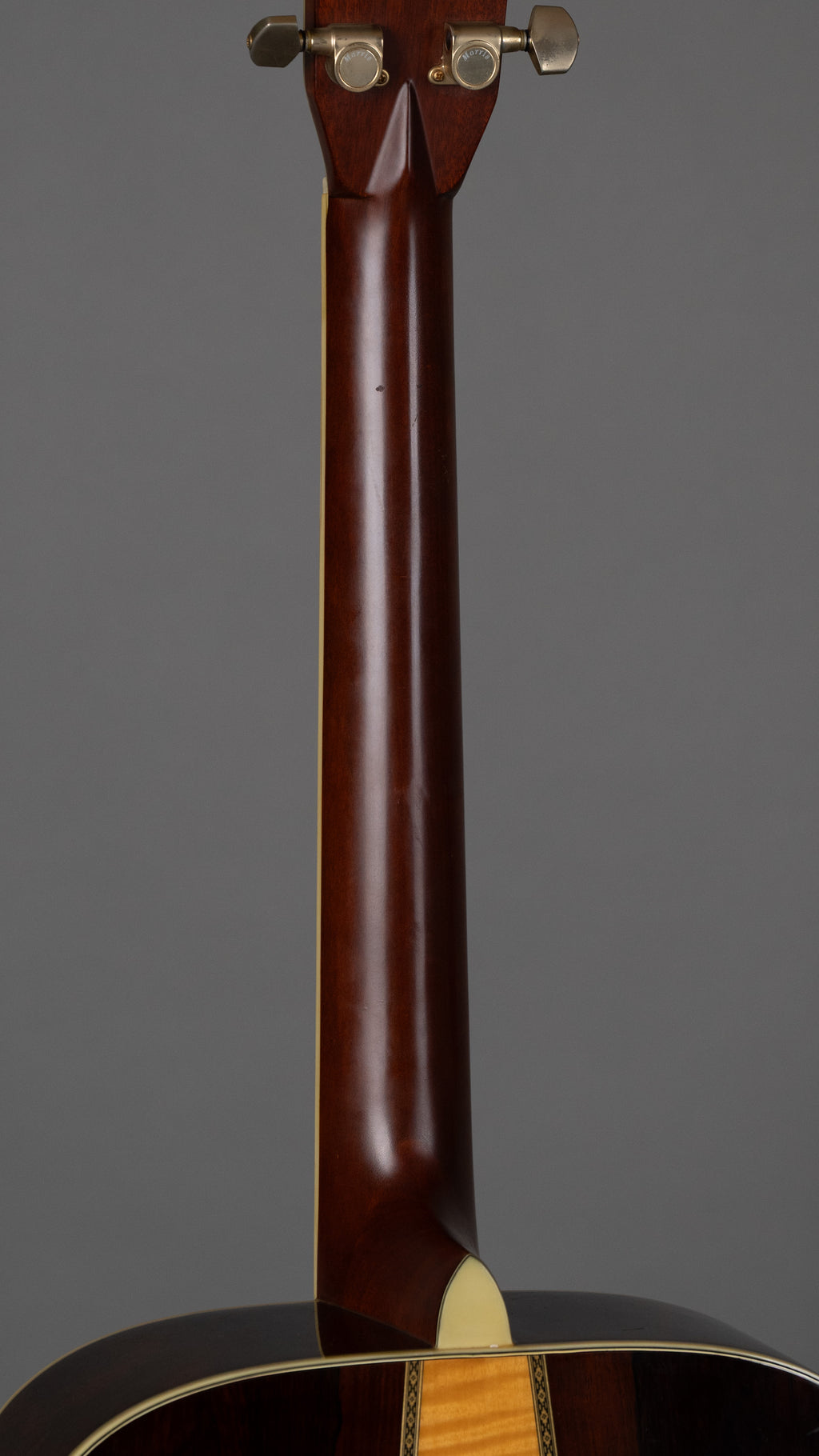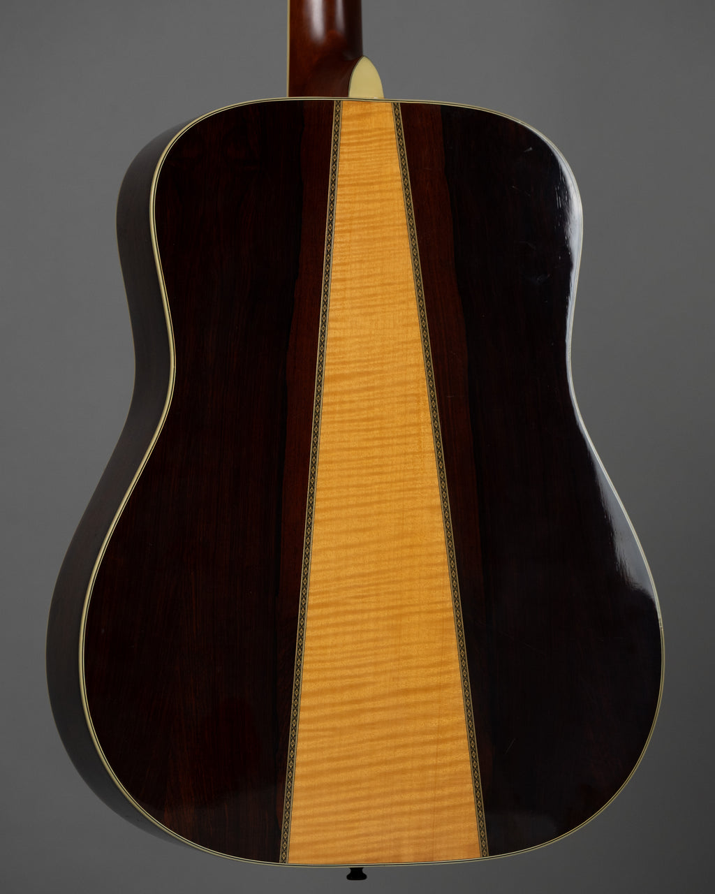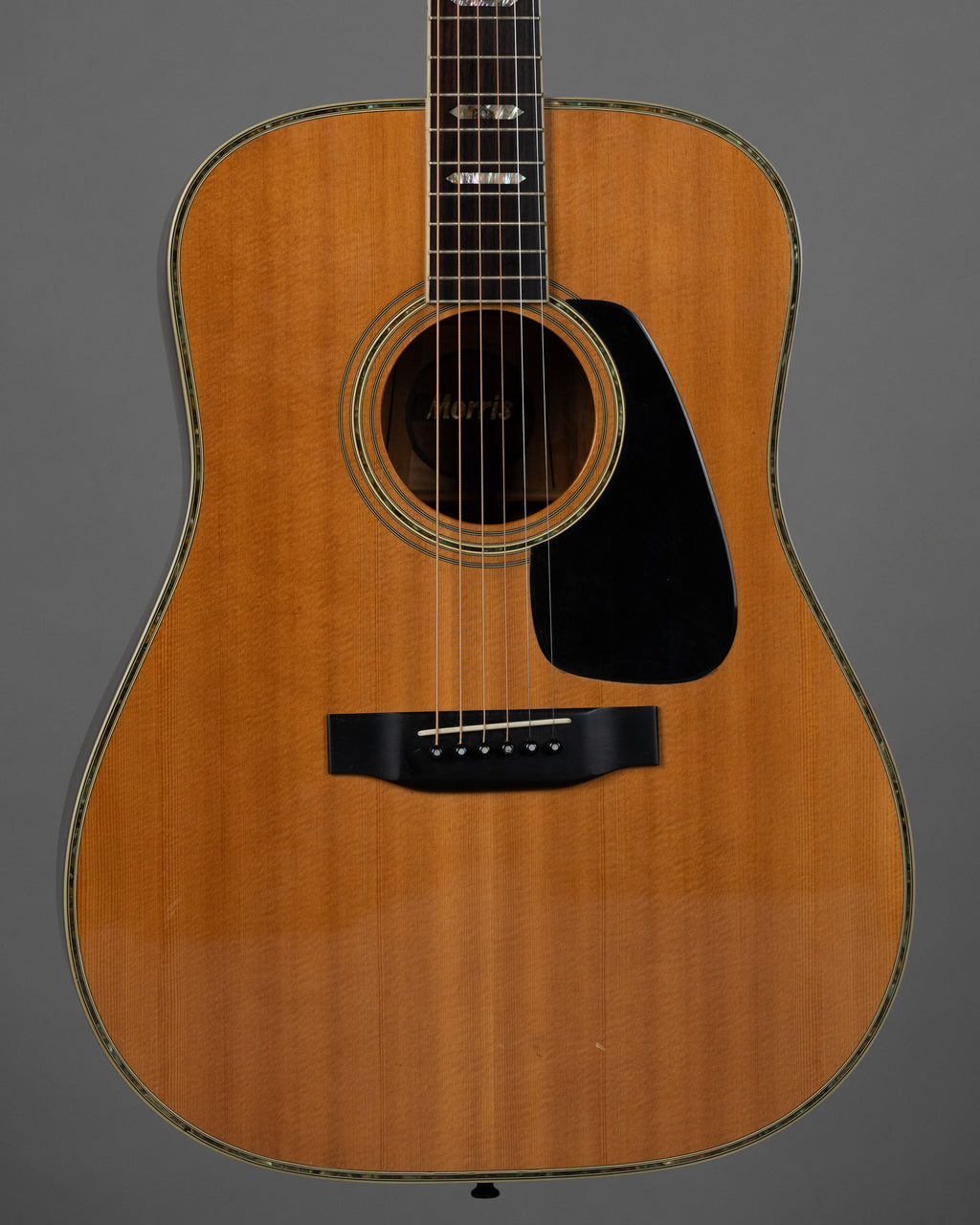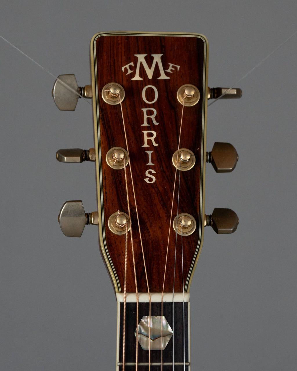 Killer Morris TF-805. It's blinged out of its brain…in fact, did this guitar even go to bed last night? Crazy Martin D-35 style and spec thing with a solid spruce top and Jacaranda back and sides. V shaped neck, volute, binding up the wazoo. Really overachieving in the visual stimulus department. Luckily it has a sound to back it up and it's not just a pretty face.