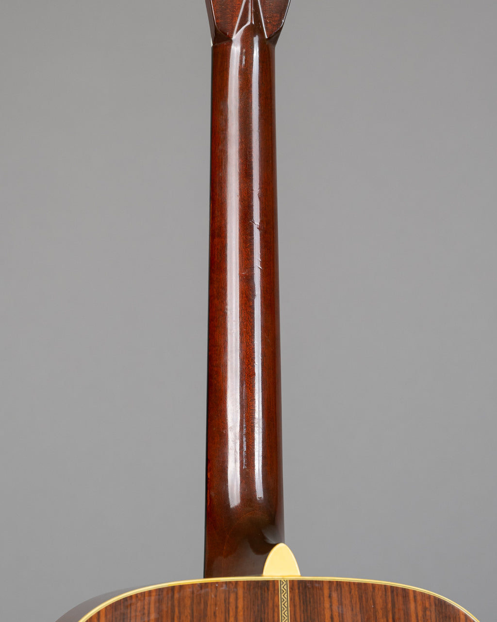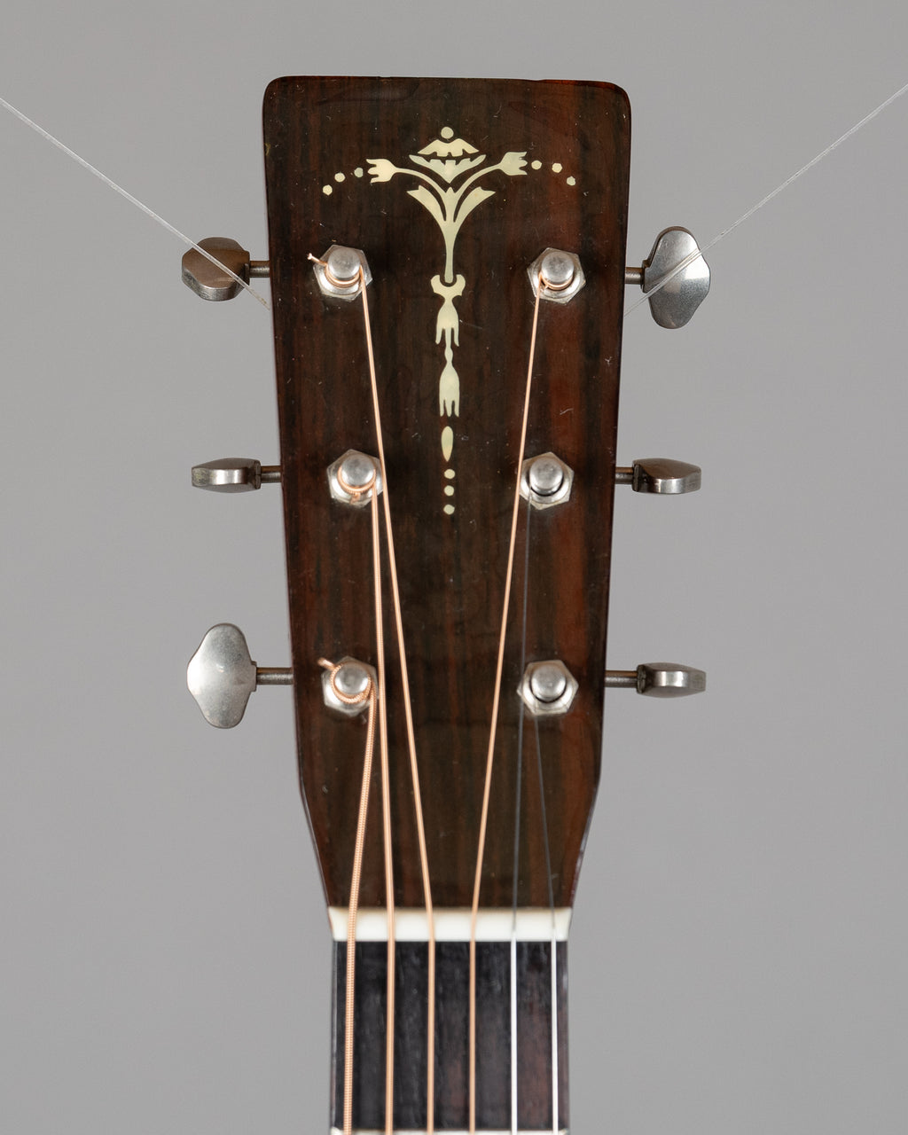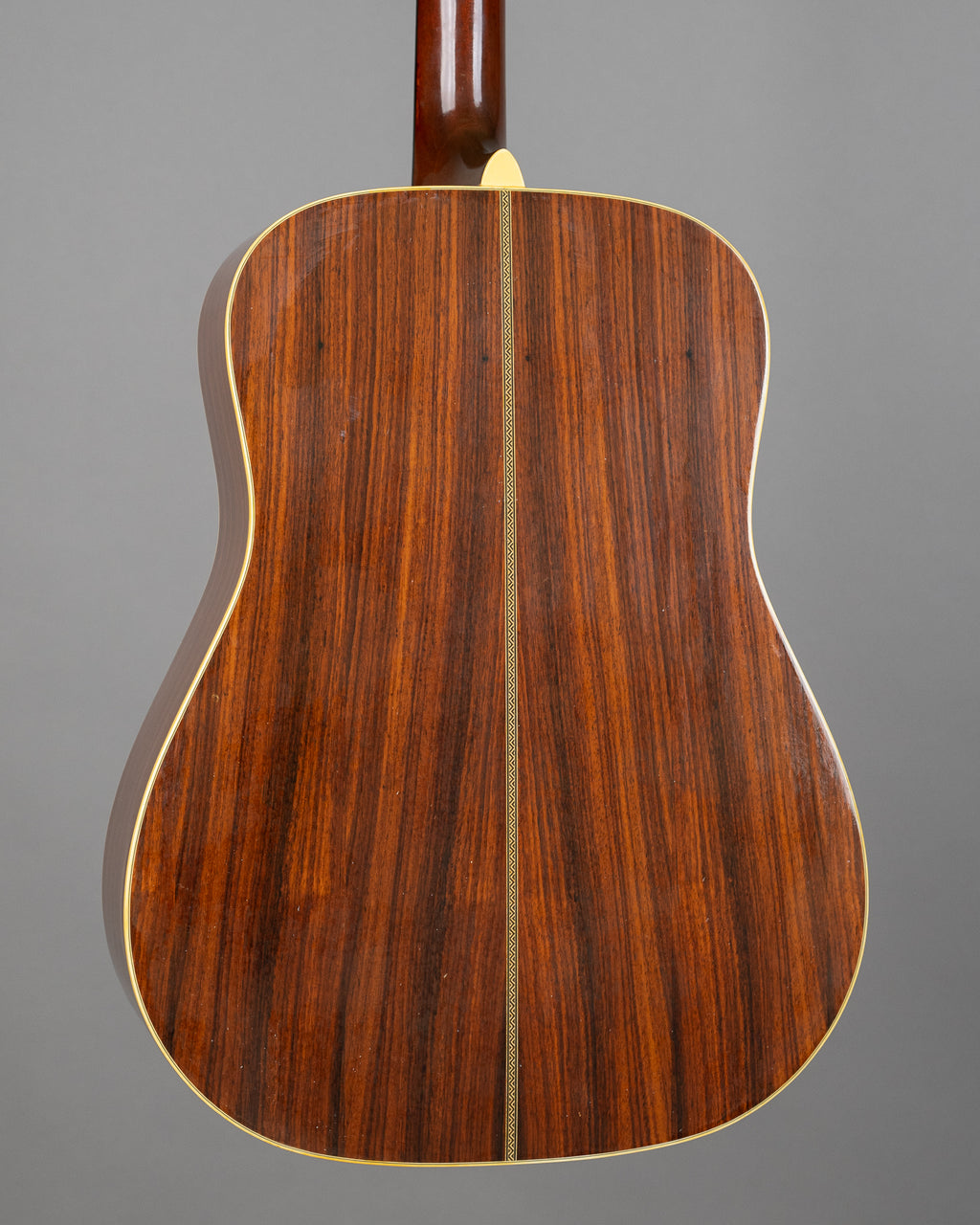 Early 80s Cat’s Eyes build from Tokai’s licensed Martin period, when they were producing some of the most accurate Pre-War style dreads outside the USA. Solid spruce top with Indian rosewood back and sides, scalloped X-bracing, herringbone purfling and the correct square Martin-style headstock with the torch inlay. Long-slotted ebony bridge and an ebony board with square-and-diamond inlays keep it very true to the blueprints they were copying at the time.