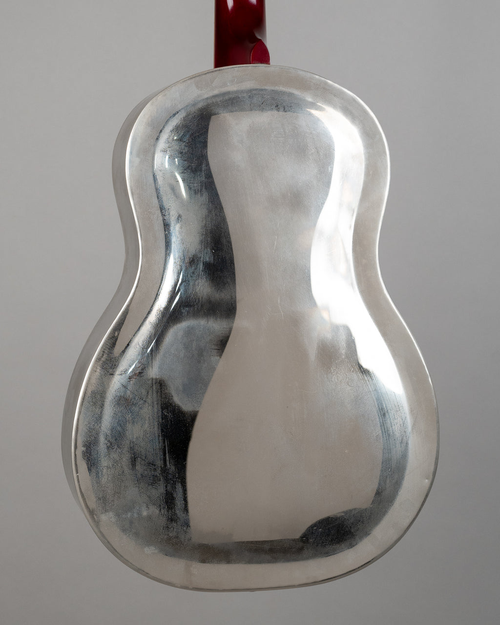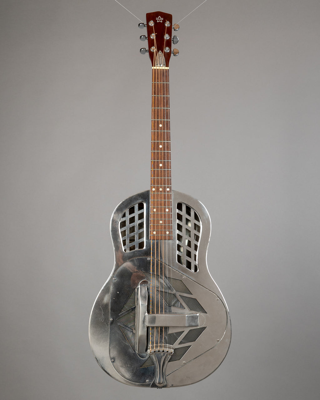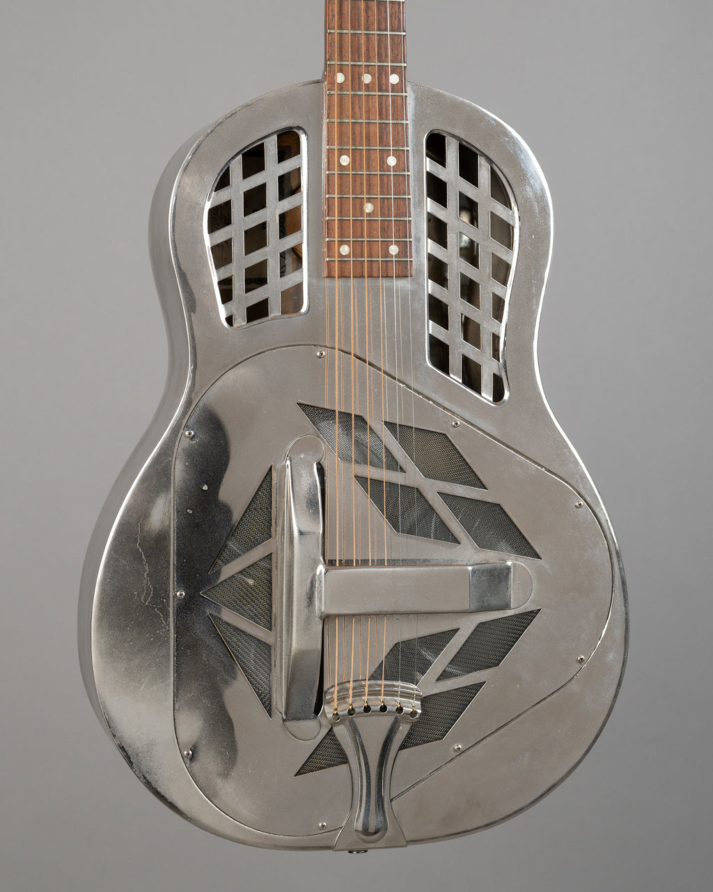 Nickel plated brass body. Plenty of volume, great tone, bulletproof build. No longer made, and definitely a great thing that punches above its price point, with a good cone. Working condition, some tarnishing on the body. This guitar definitely proves that you can have the Blues, and not feel too deflated..or maybe even feel ecstatic.