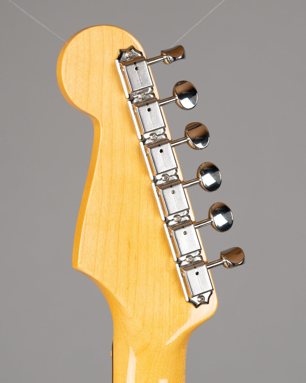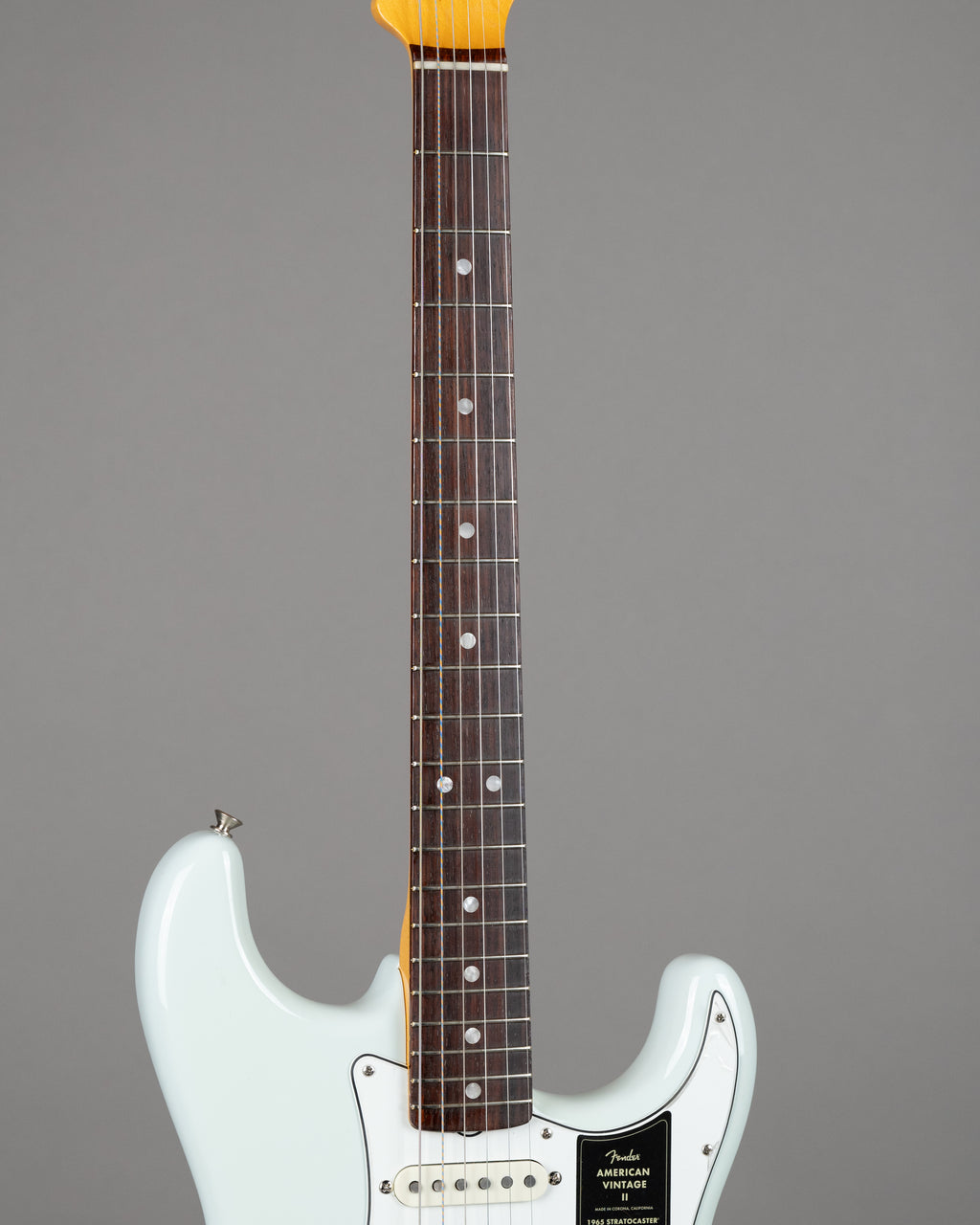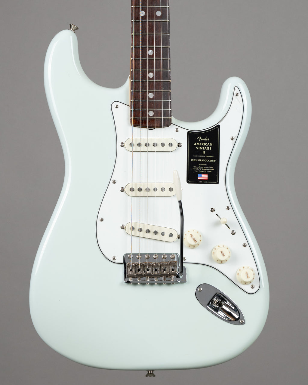 Relive the sound and spirit of 1965 with the American Vintage II 1965 Stratocaster. Smack in the middle of one of music’s most electrifying decades, the Stratocaster in 1965 was an instrument on its way to becoming rock’s greatest electric guitar. A perfect example of a Strat in a transition year, the 1965 Stratocaster® features a 1965 “C”-shaped maple neck, this time with a round-laminated rosewood fingerboard and larger pearl dot inlays. Other authentic features include an 11-hole three-ply white pickguard, the incredibly cool transition logo with larger lettering, and a set of amazing “gray bottom” Pure Vintage 1965 pickups.