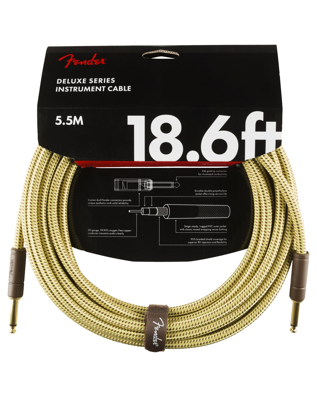 Fender Deluxe Series cables carry the highest quality materials and braided shielding to deliver flagship durability, conductance and transparency. Our top-of-the-line cables sport custom molded ends with strain relief under the housing - plus 24K gold-plated connectors that won't tarnish or degrade your sound over time. These cables use a very quiet braided shielding that is engineered to maximize the purity of your tone, and they're protected by a soft-woven yet rugged tweed jacket that provides ultimate protection with classic Fender style.