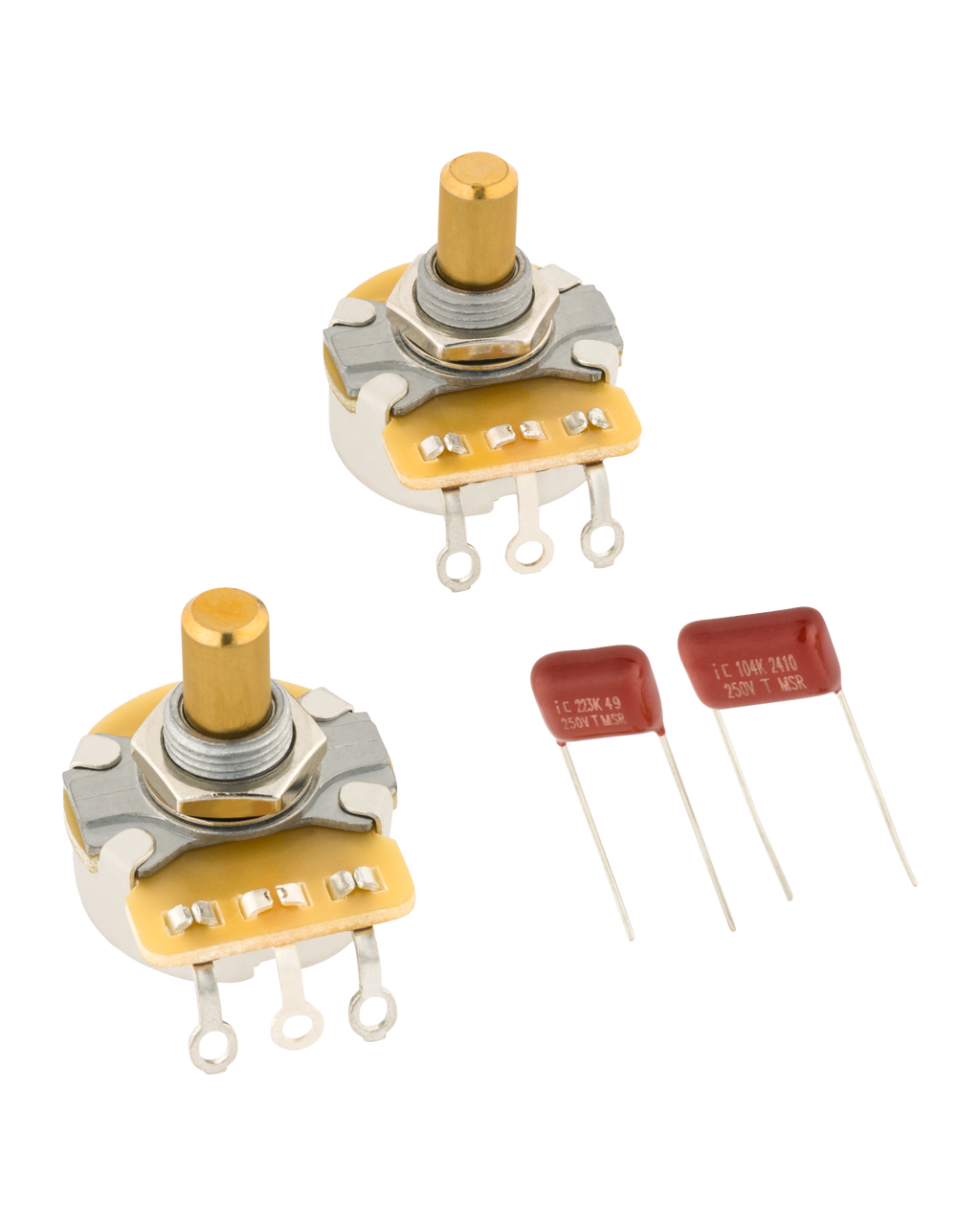 Upgrade your Telecaster® volume and tone control responsiveness with this complete potentiometer/capacitor kit. Featuring two CTS® 250k solid shaft audio taper pots and two metalized polyester film capacitor options, this kit delivers smooth, reliable control over your volume and tone shaping. A choice of two capacitors will help nail either modern (.022μF) or vintage-style (.100μF) tone control roll-off characteristics and each 3/8" potentiometer comes complete with mounting hardware. Whether you're restoring a classic Tele® or upgrading a newer model, these high-quality pots and caps provide the consistent performance that players demand.
