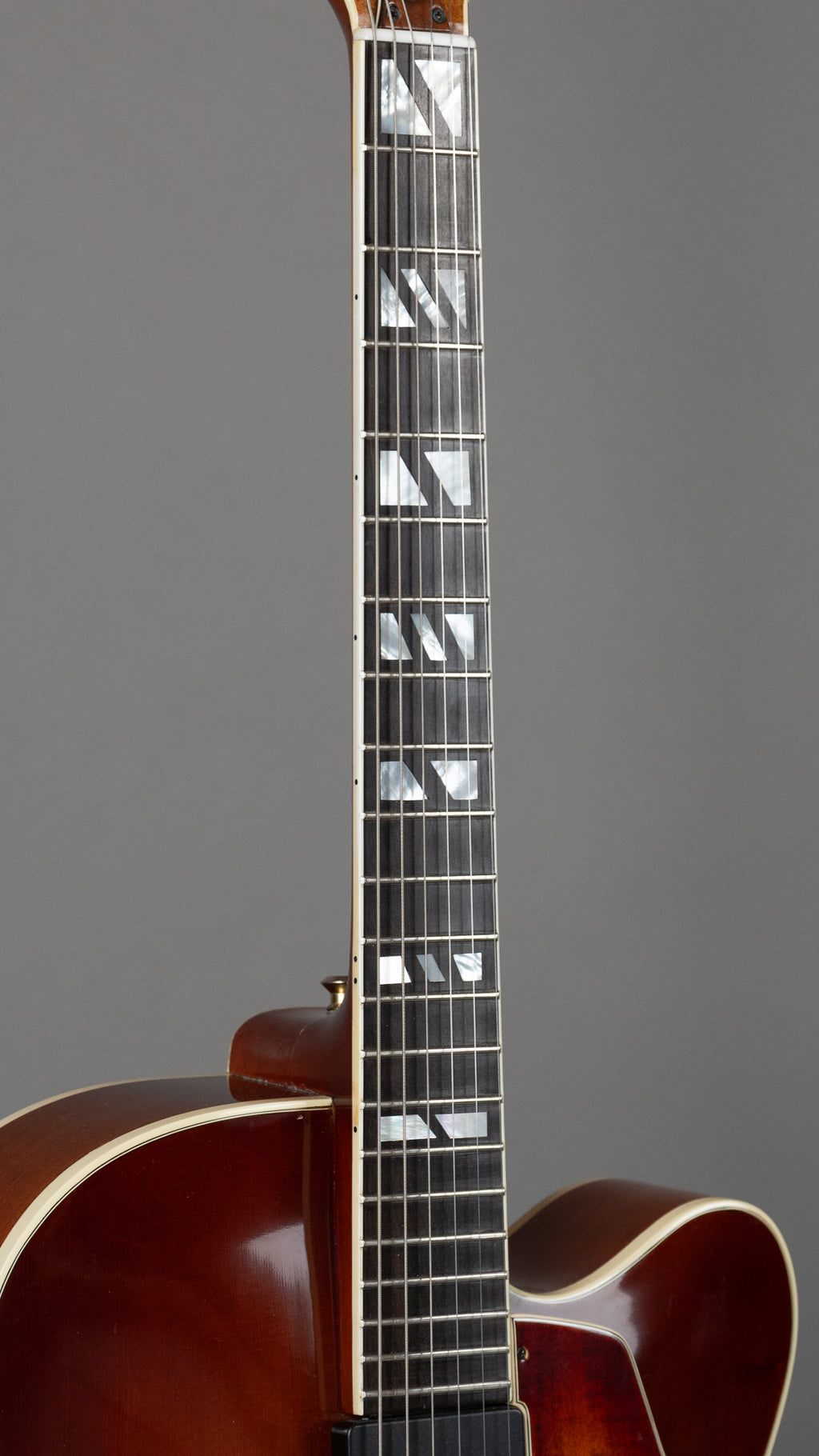 Loaded with an EMG pickup (active! battery mounted in the F-hole), floating bridge and tailpiece, Grover tuners, and a bound tort-style guard. The neck heel has been professionally reglued, with some finish lift visible at the join. Few other minor playmarks around the body and neck, and some adhesive residues beneath the guard from various mounting strategies. The model is marked W.S.A.T. with the serial listed as “Special,” likely a custom one-off. Includes a high-quality fibreglass hardcase made in WA. Signed by the luthier on soundhole label.