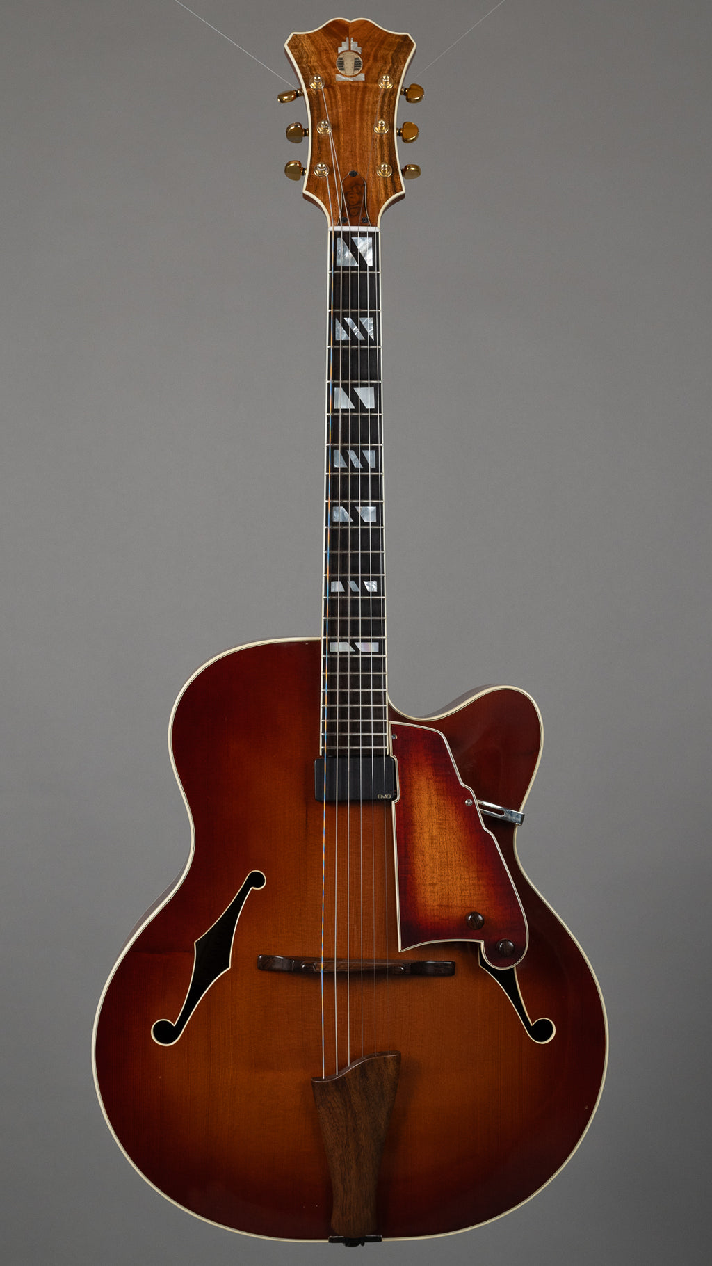 Hand-built by Barry Kerr of Woodtone Guitars in Hamilton, VIC, this 18" New York-style archtop is a beautifully executed piece of Australian luthiery. It features a solid carved spruce top, carved Blackwood back and sides, and a birdseye maple neck.